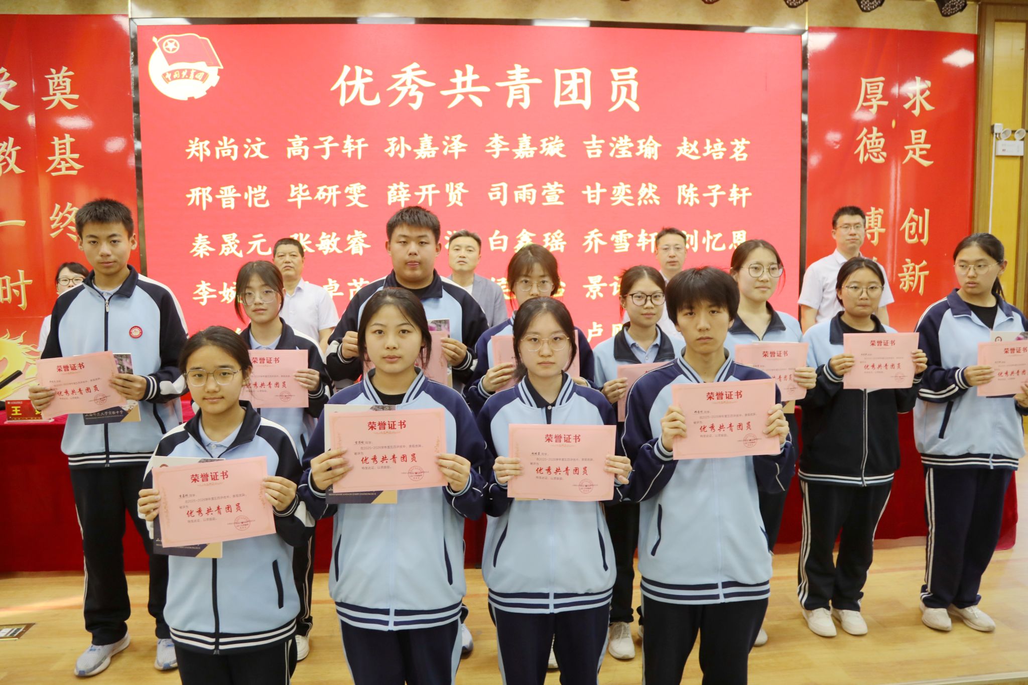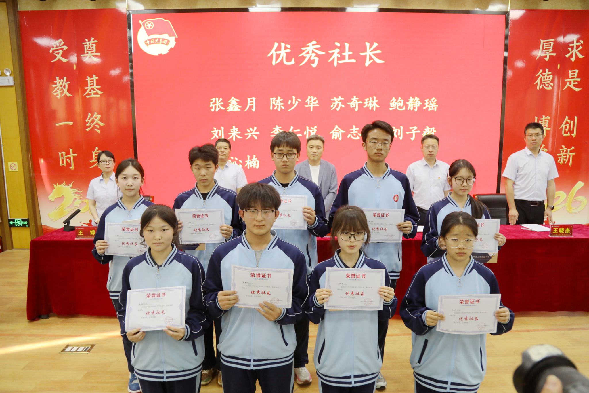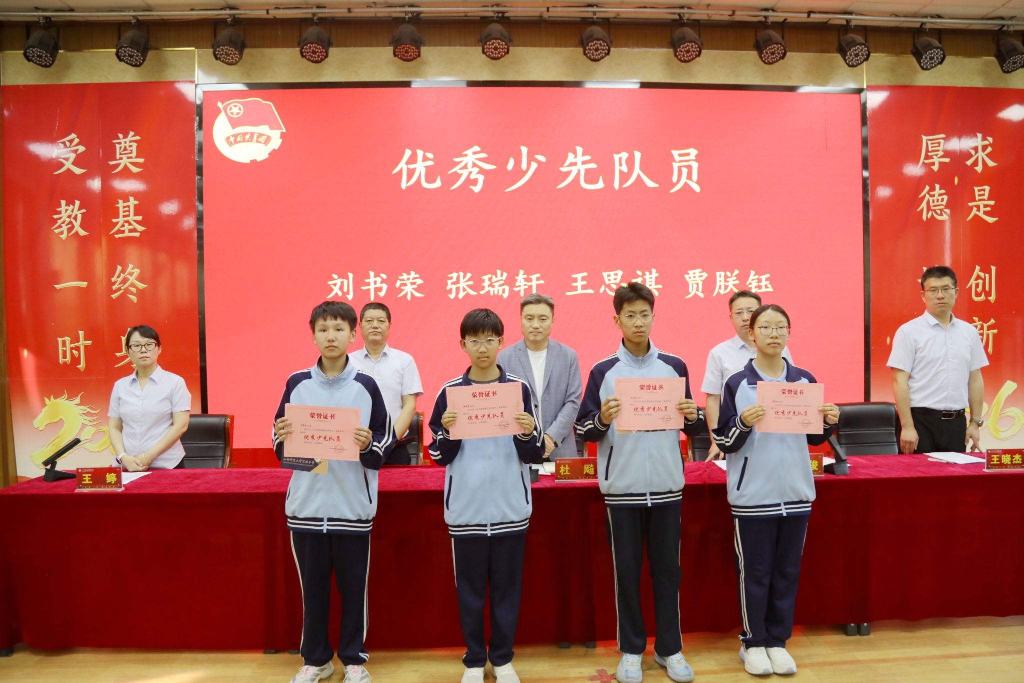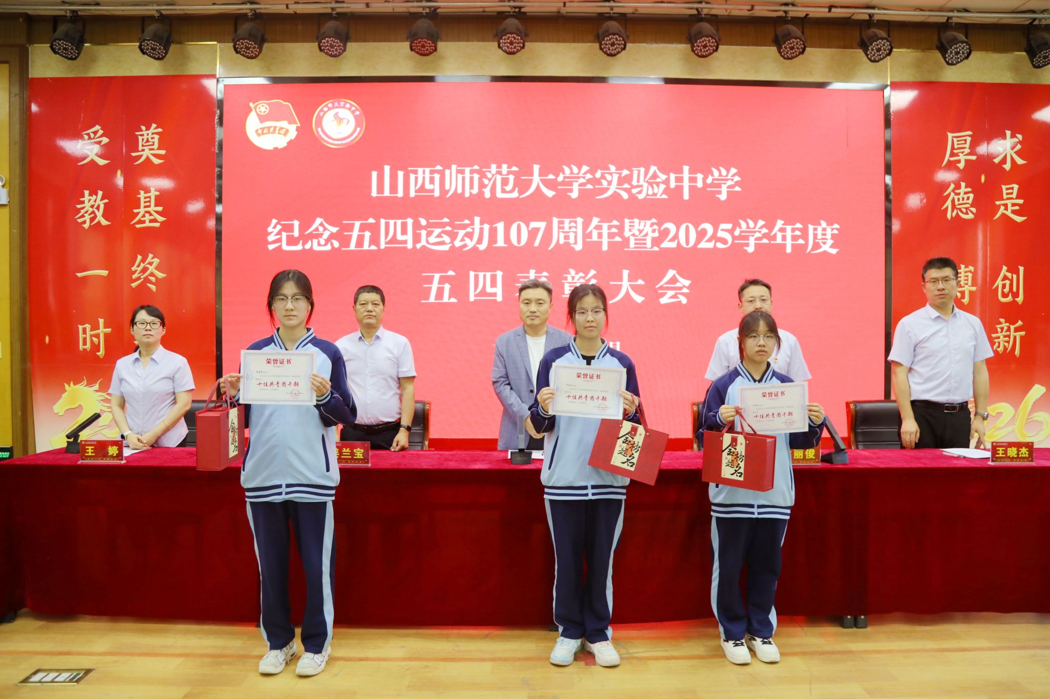 校党委副书记侯丽俊(挂职)宣读了《共青团山西师范大学实验中学委员会关于表彰2025年度五四先进集体和优秀个人的决定》。在欢快的颁奖乐曲中,与会领导依次为获得表彰的先进集体代表和优秀个人颁发荣誉证书,并合影留念。这份荣誉是对他们过去一年努力与付出的肯定,更是对未来接续奋斗的鞭策。