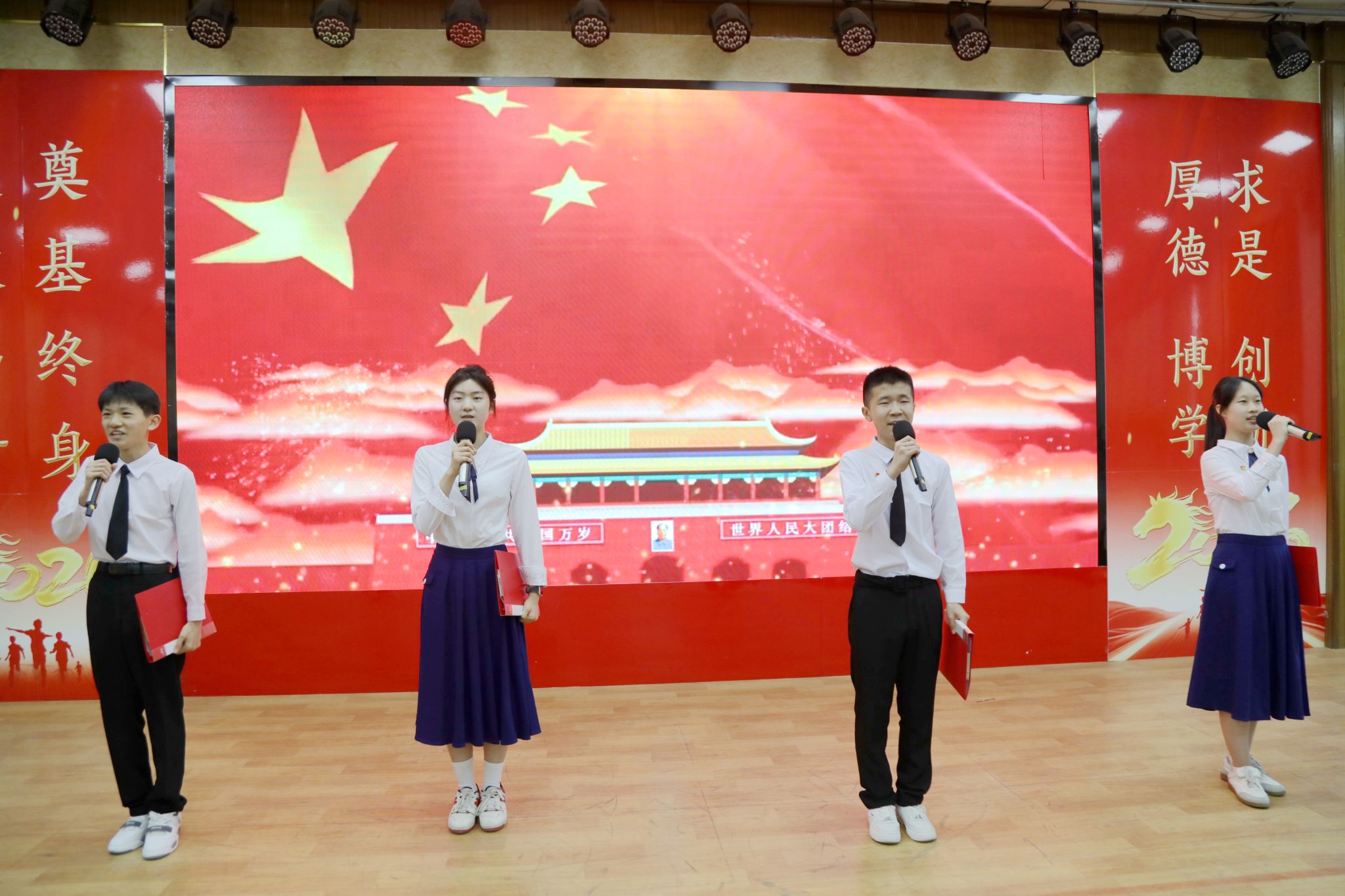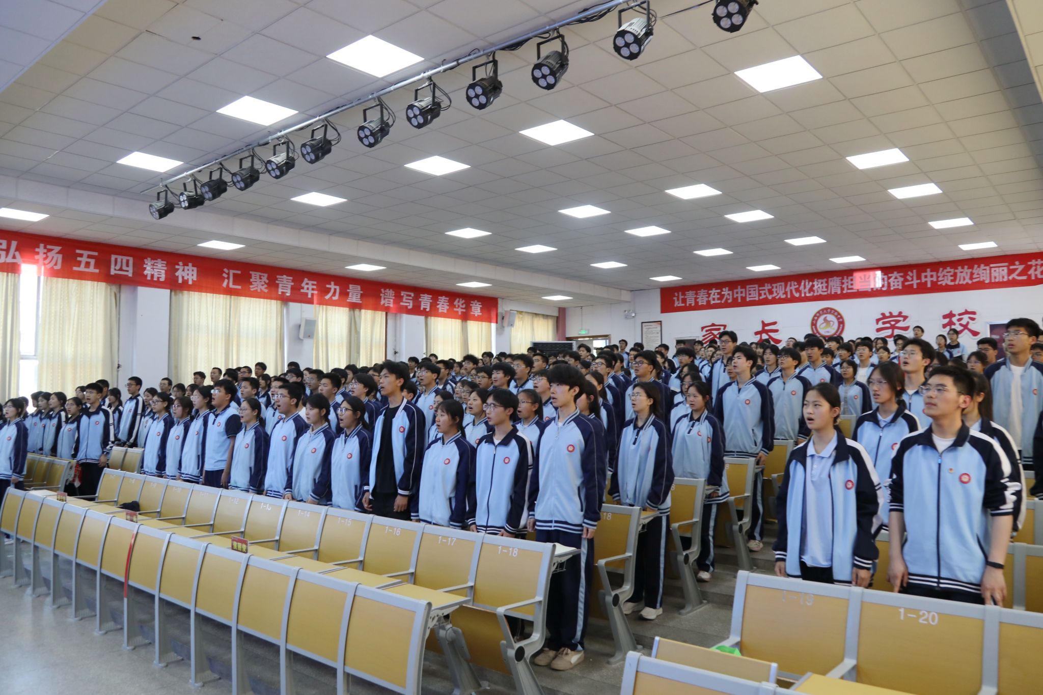 学校星火宣讲团带来的情景朗诵《以青春之名礼赞中国》激情上演。同学们用铿锵有力的声音和富有感染力的表演,深情讴歌了五四先驱的爱国情怀与青春理想,引发了全场学生的强烈共鸣。