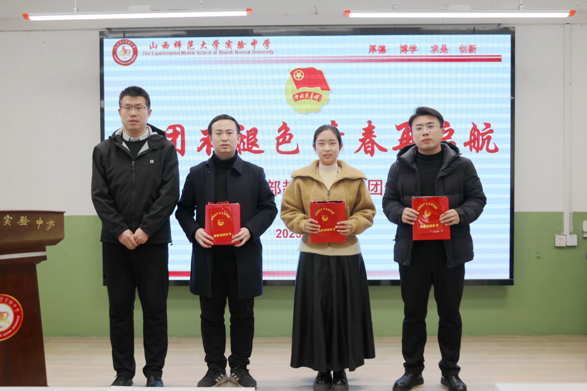 校团委书记王晓杰向超龄团员杨莹、张力元和吴皓颁发离团纪念证及离团纪念品。