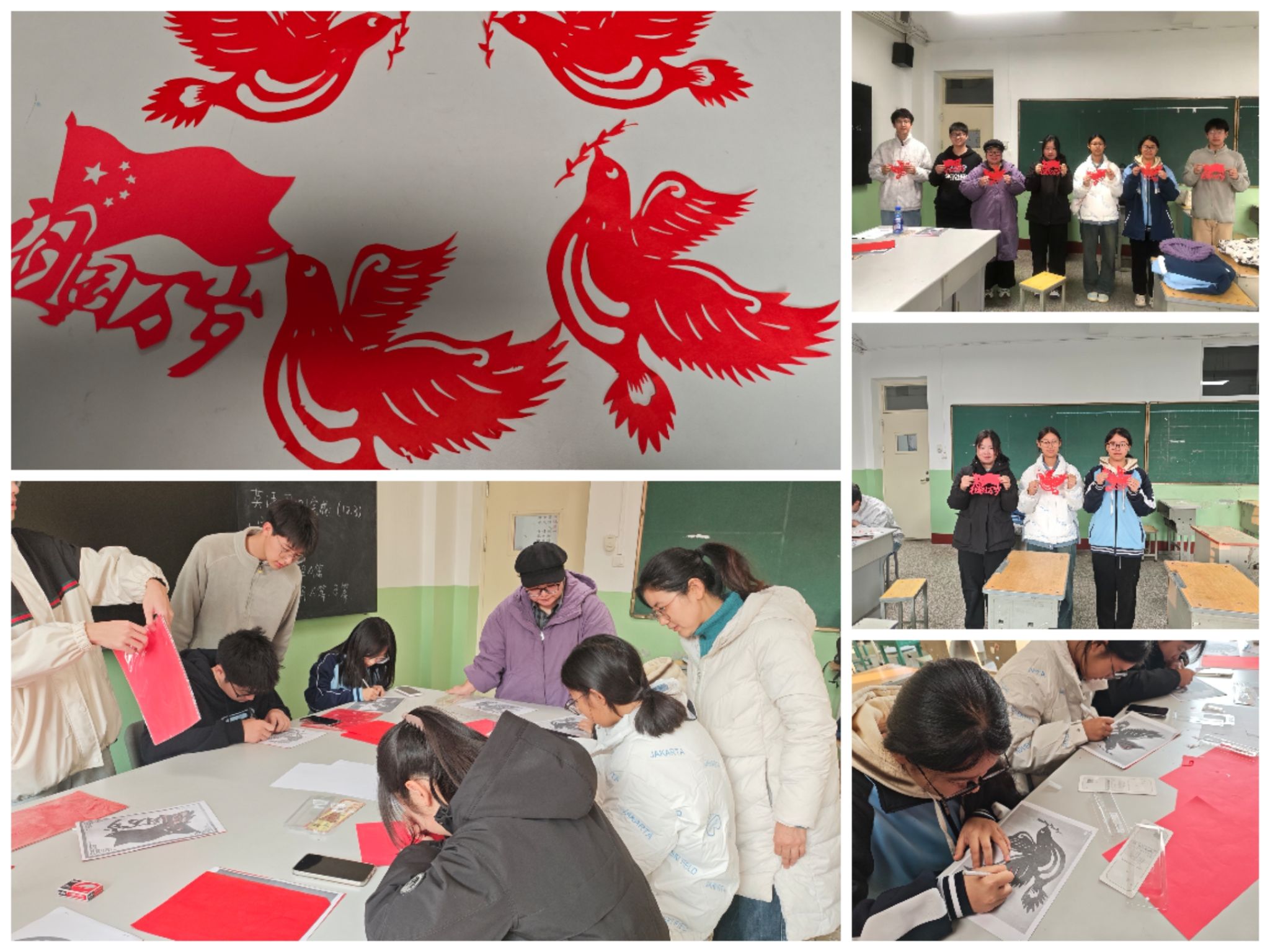 各学生社团以特色活动为载体,表达对历史的敬畏与对和平的向往。书法社开展“墨韵寄哀思,丹心颂和平”主题创作,笔墨间饱含着对遇难同胞的深切缅怀和对和平的执着追求;逸彩绘以国旗为创作主题,通过艺术笔触定格家国情怀,寄托对历史的深切追思与对和平的坚定守护;剪纸社和手工社将非物质文化遗产剪纸艺术与爱国主义教育相结合,以精巧的作品传递学子的赤子之心与坚定信念;朗诵社则依托校园朗读亭举办“以声寄思,诵读和平”主题诵读活动,用深情诵读追溯民族过往、告慰遇难英灵,传递对和平的珍视与对未来的期许。
