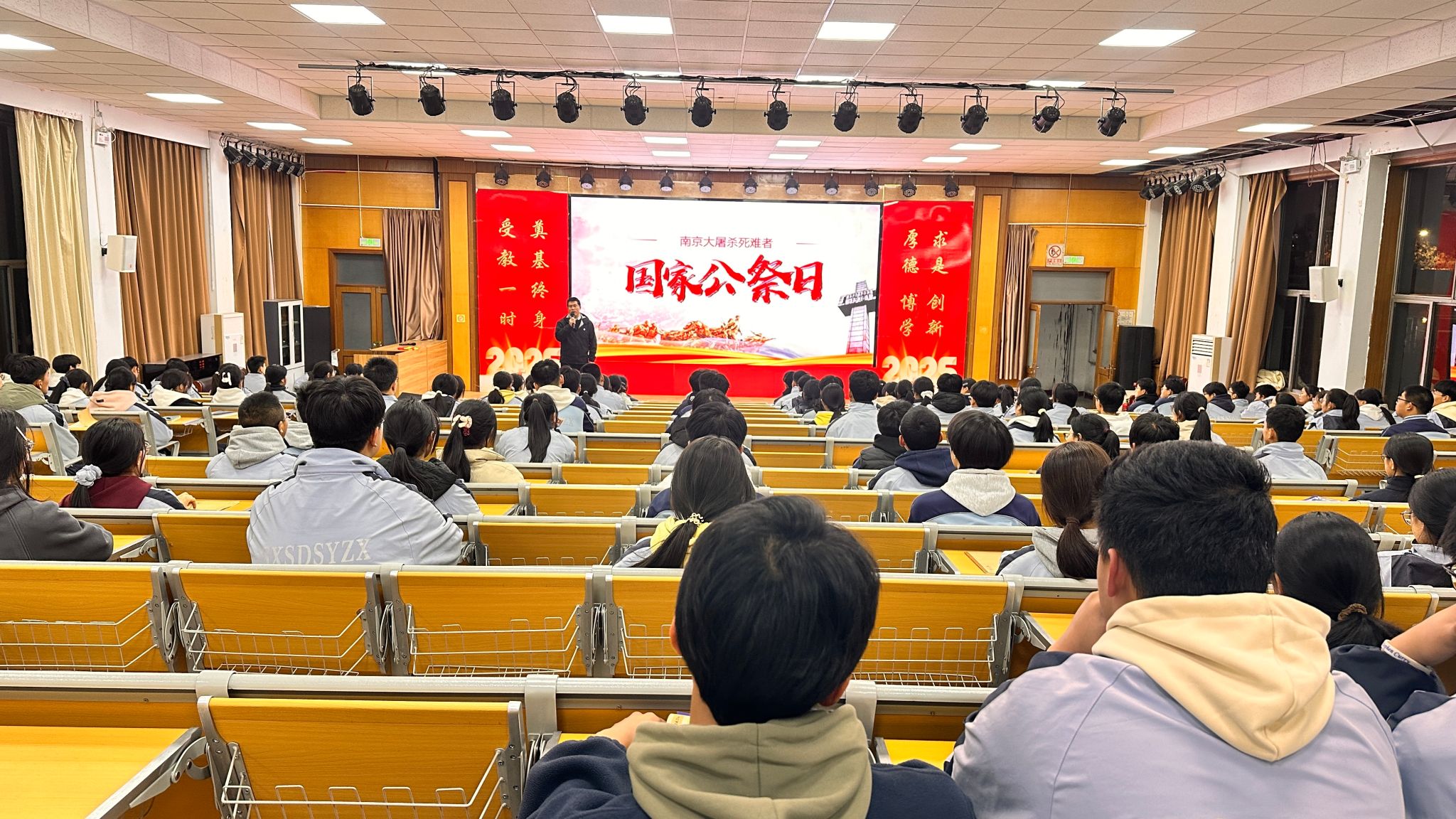12月12日,校团委书记王晓杰面向全校200多名团员和少先队员讲授《国殇永铭 吾辈自强》主题团课。他详细梳理南京大屠杀的历史脉络与深远影响,重温习近平总书记重要讲话精神,深入解读公祭鼎铭文和《和平宣言》的深刻内涵。王书记寄语青年们,要将爱国之情转化为实际行动,努力学习科学文化知识,积极投身社会实践,为实现中华民族伟大复兴的中国梦贡献自己的力量。