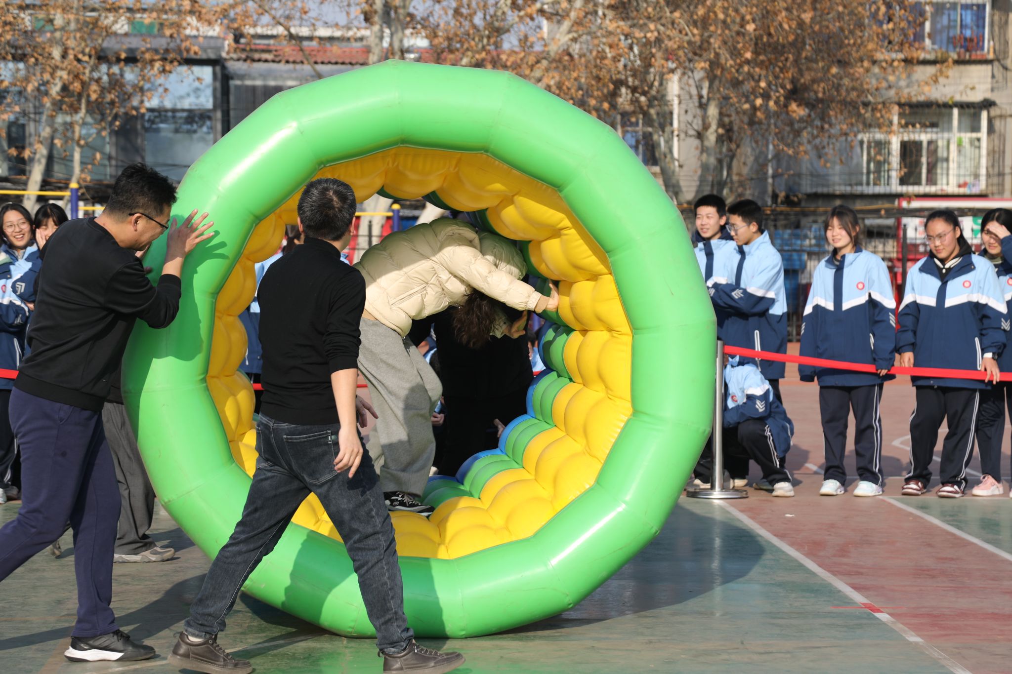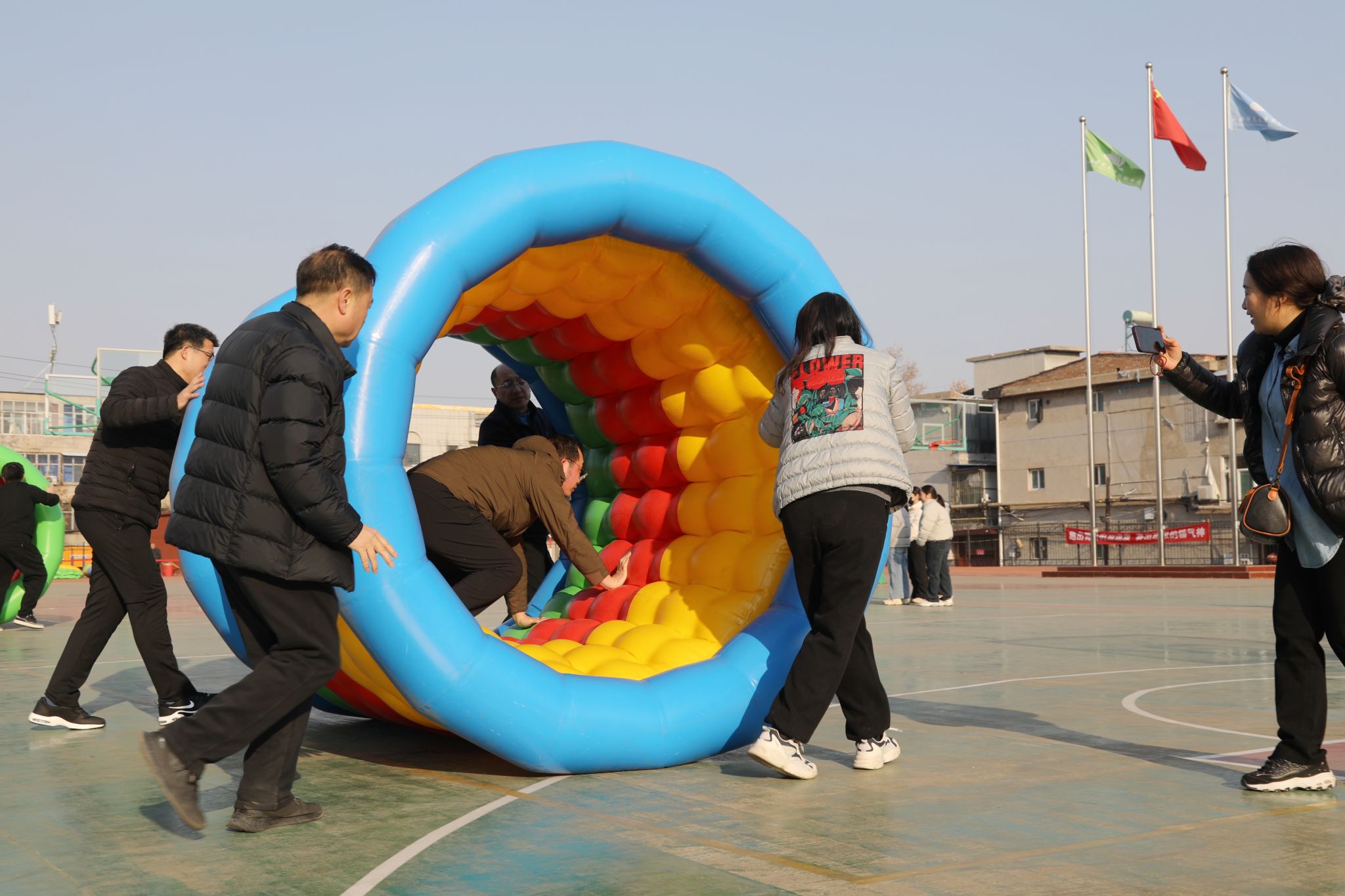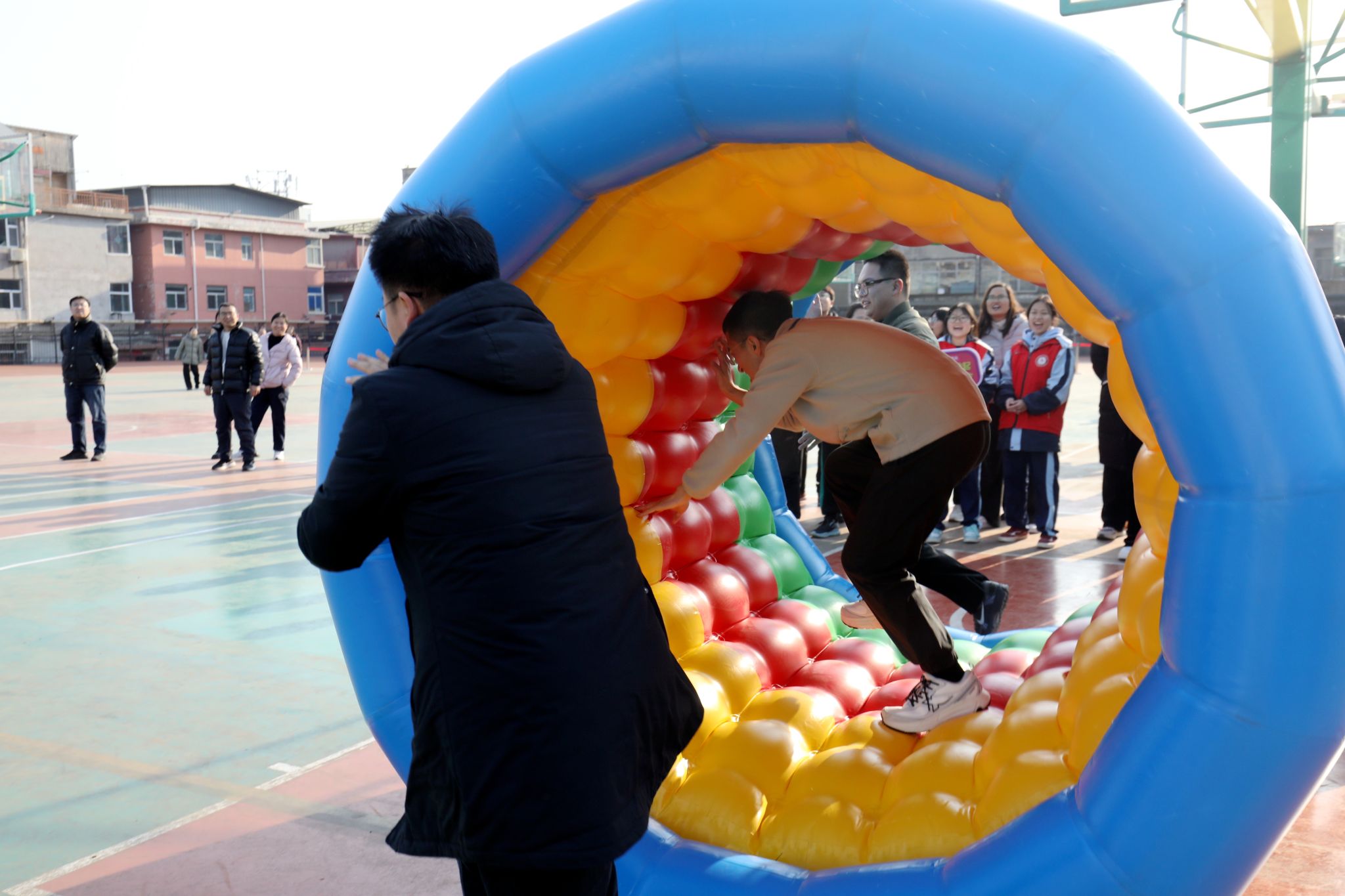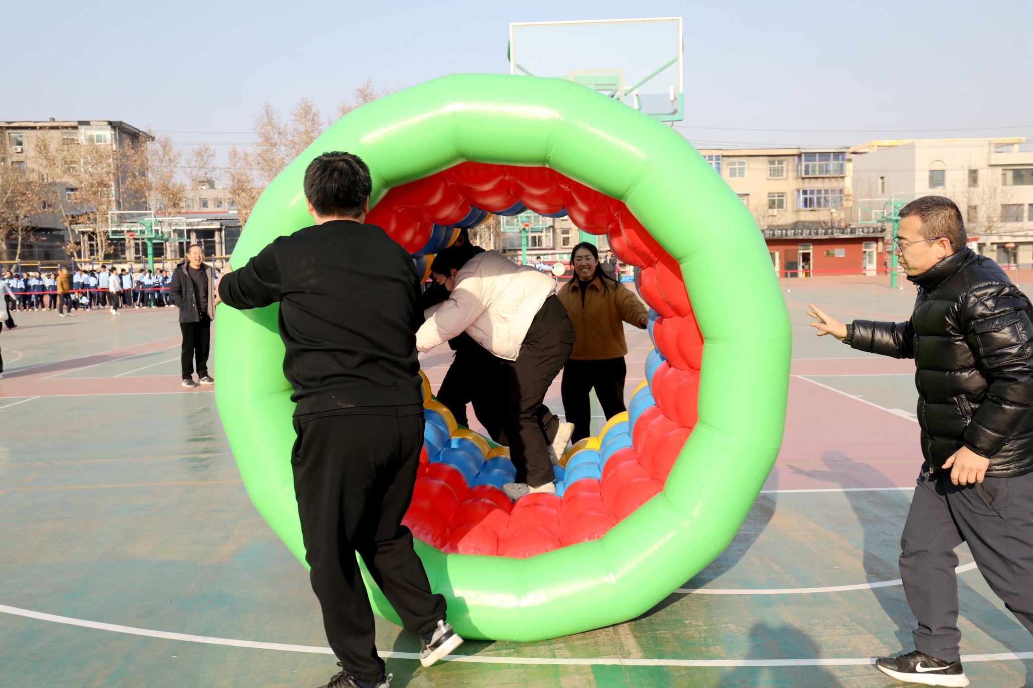 “动感五环”充气滚筒接力更是将挑战和趣味拉满,“内推外导”的比赛模式,需要在速度和稳健之间找到平衡,老师们不断调整步伐、同步发力,五彩的滚筒后留下一路欢笑。