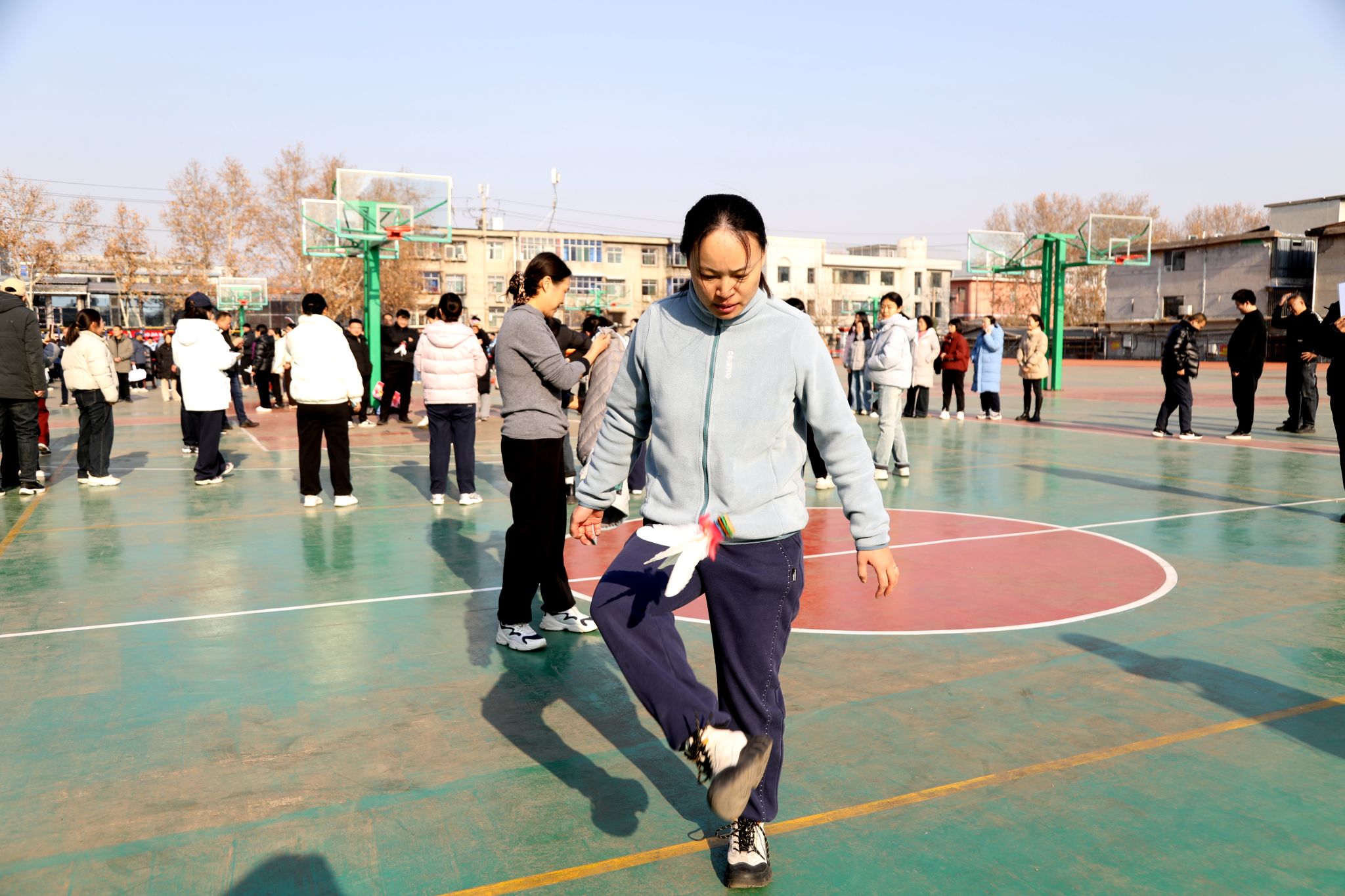作为我校的传统运动项目,“1分钟踢键计数赛”率先精彩开场,毽影飞舞间,老师们灵活腾挪、身姿矫健,脚下毽子起落翻飞,瞬间点燃全场氛围。