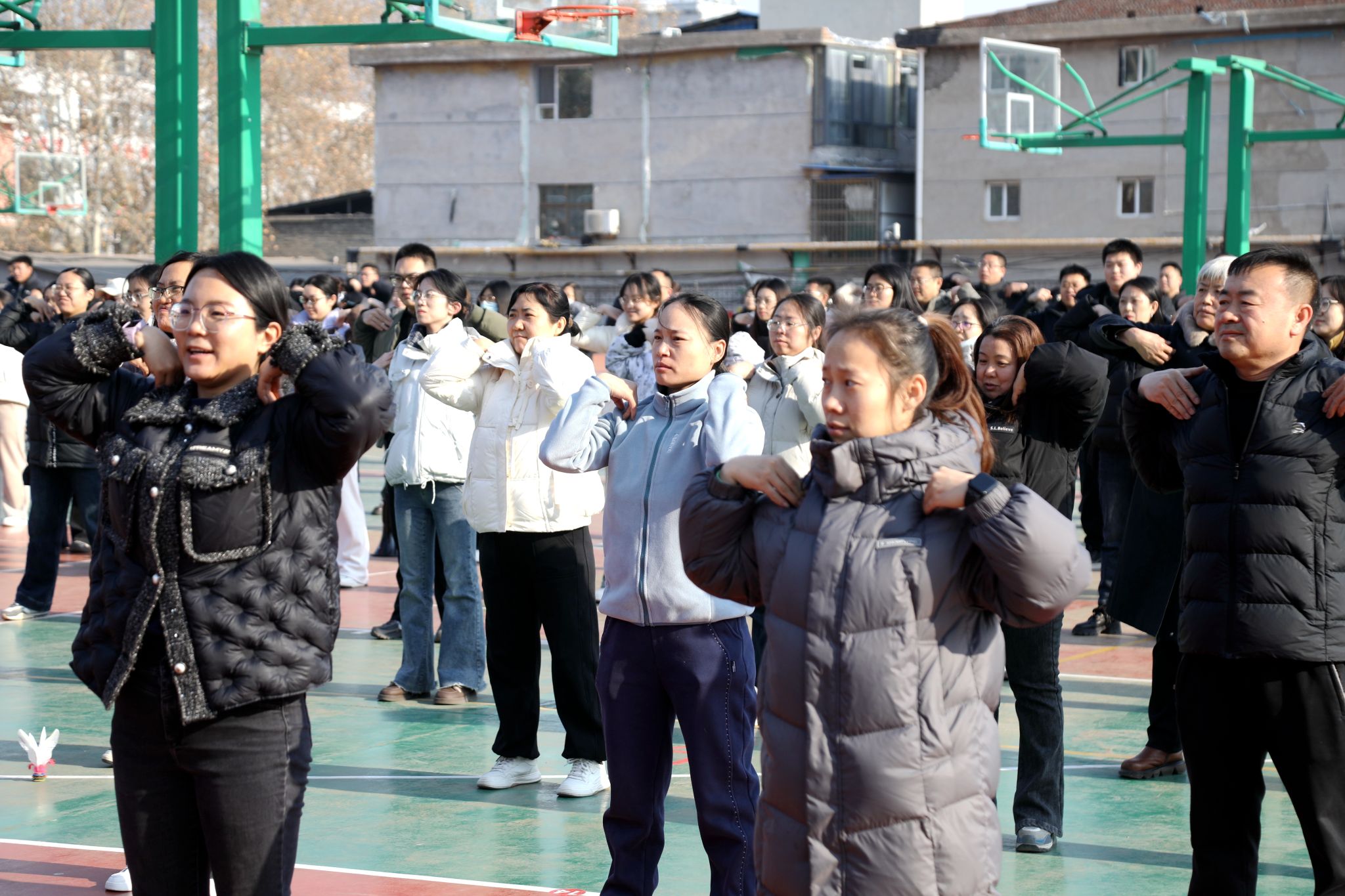 比赛开始前,老师们在健美操队学生的带领下,跳起热情洋溢的韵律操,伸展、扭转、跳跃的身影与欢快节奏同频共振,充分完成热身准备,以饱满状态迎接比赛。