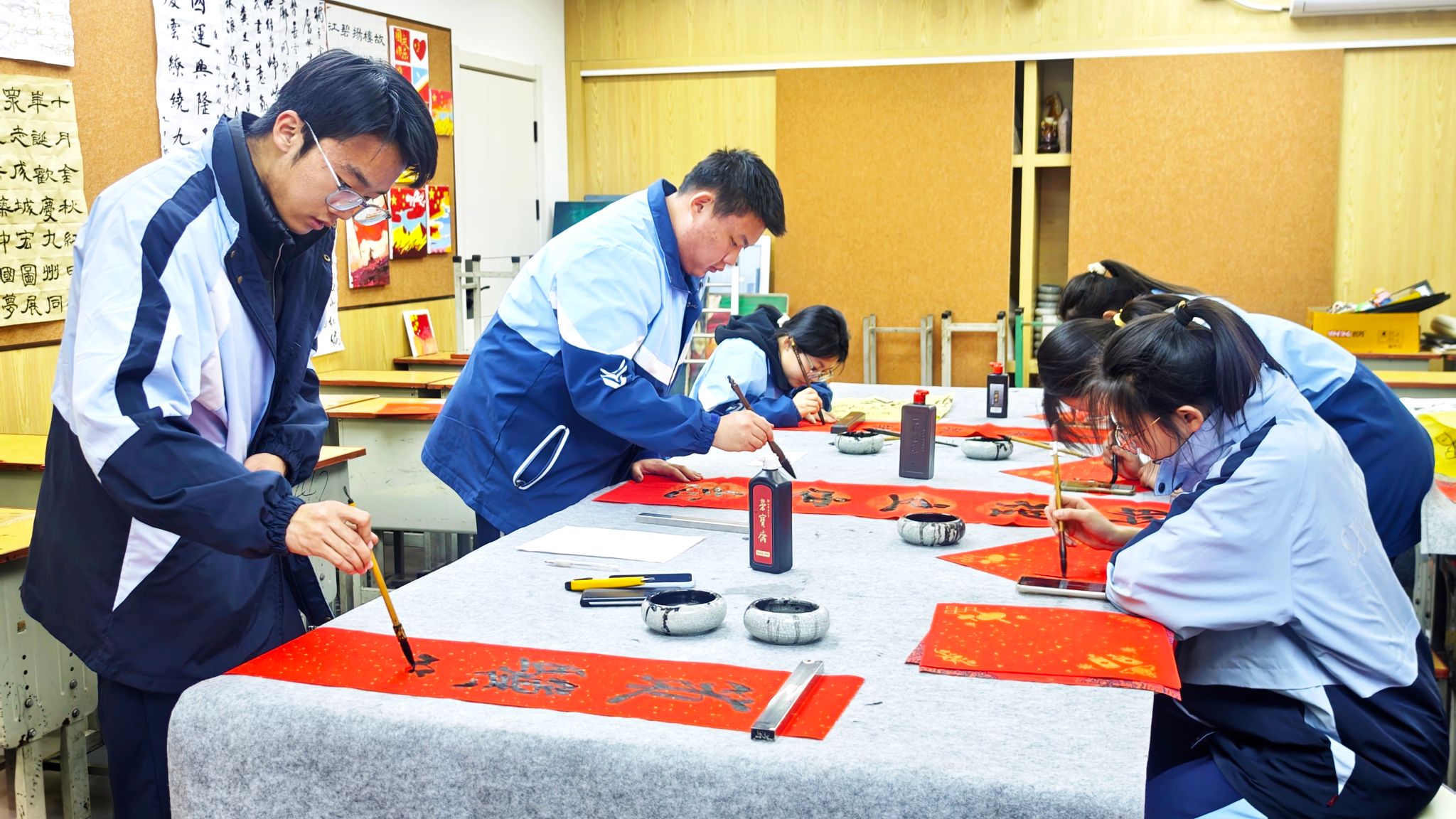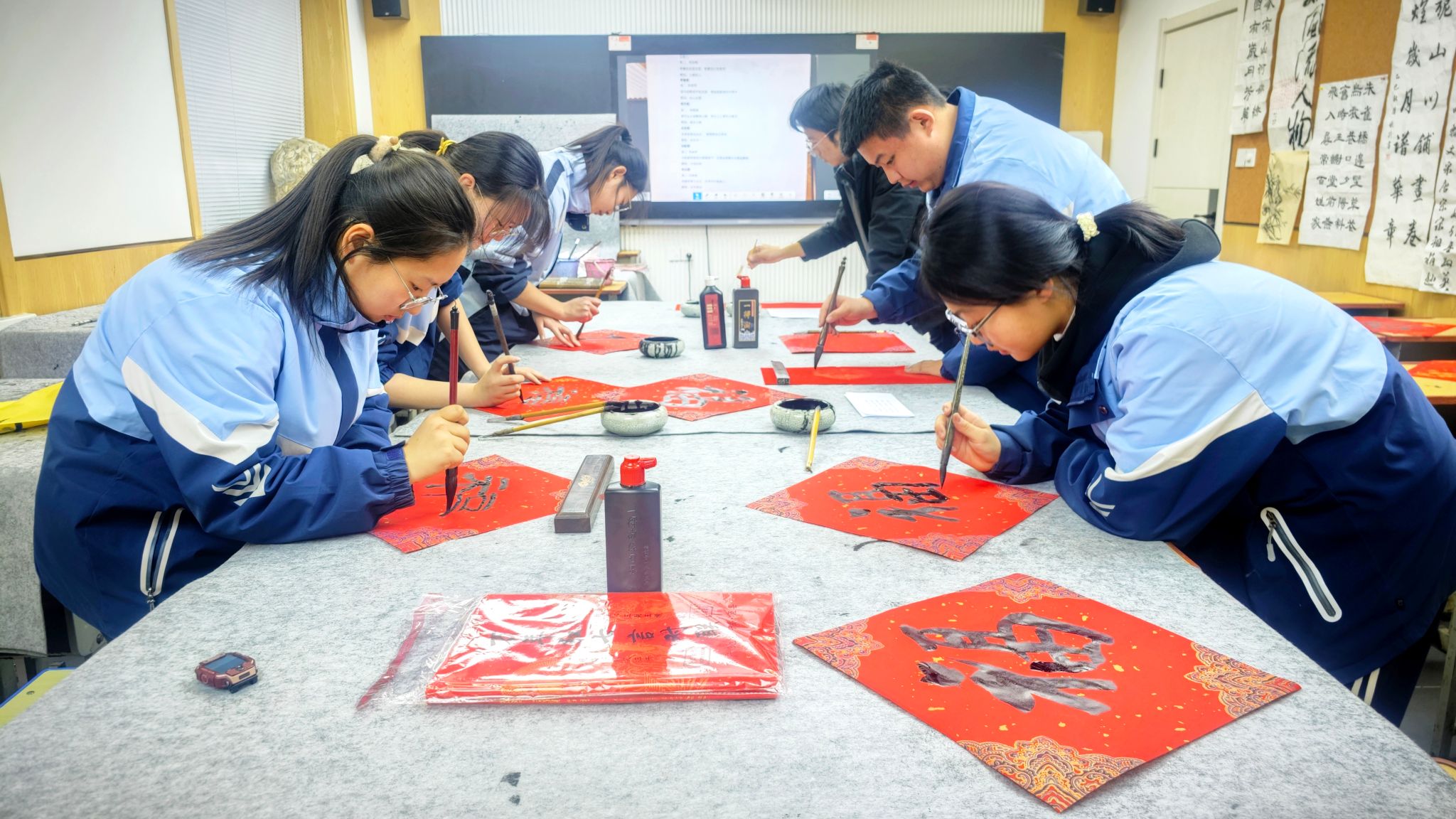 为让优秀春联更好地装点校园,此次学校春联书写任务由墨韵书法社团学生承担。只见同学们凝神静气、挥毫泼墨,一笔一划间尽显扎实功底。