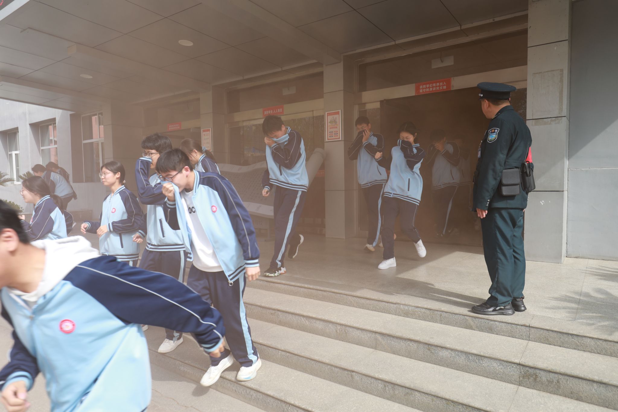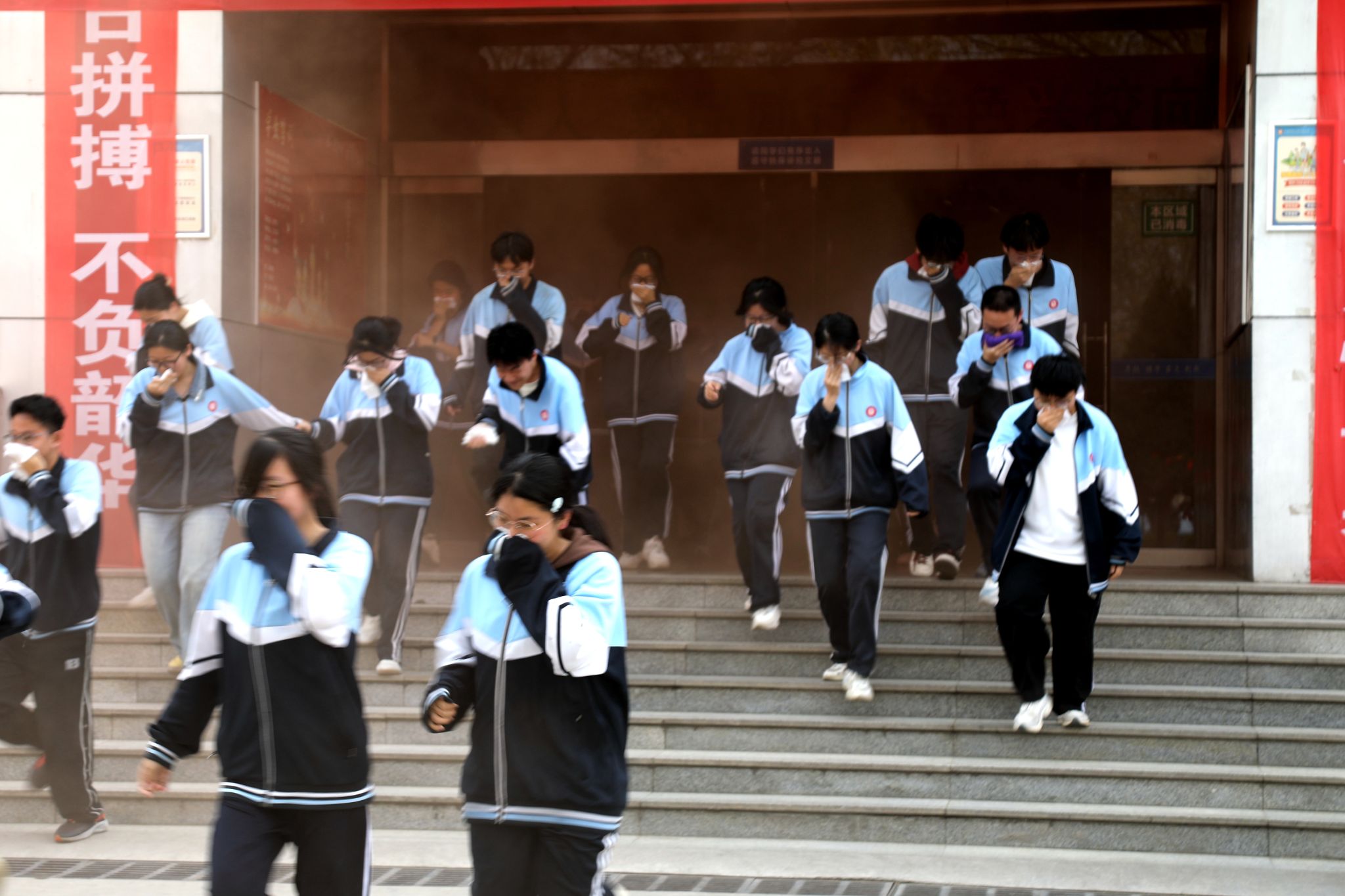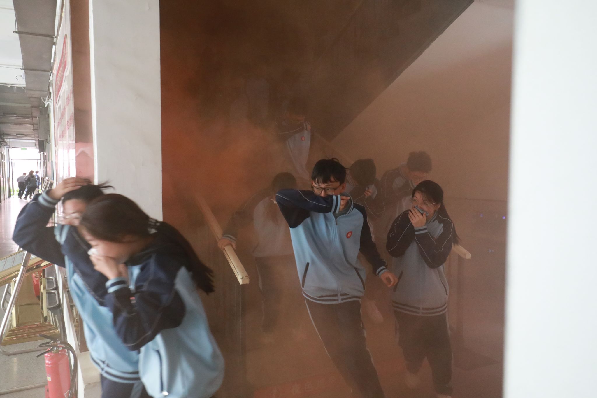随着警报声响起,全体师生按照疏散路线,弯腰捂鼻、低姿前进,整个疏散过程秩序井然。