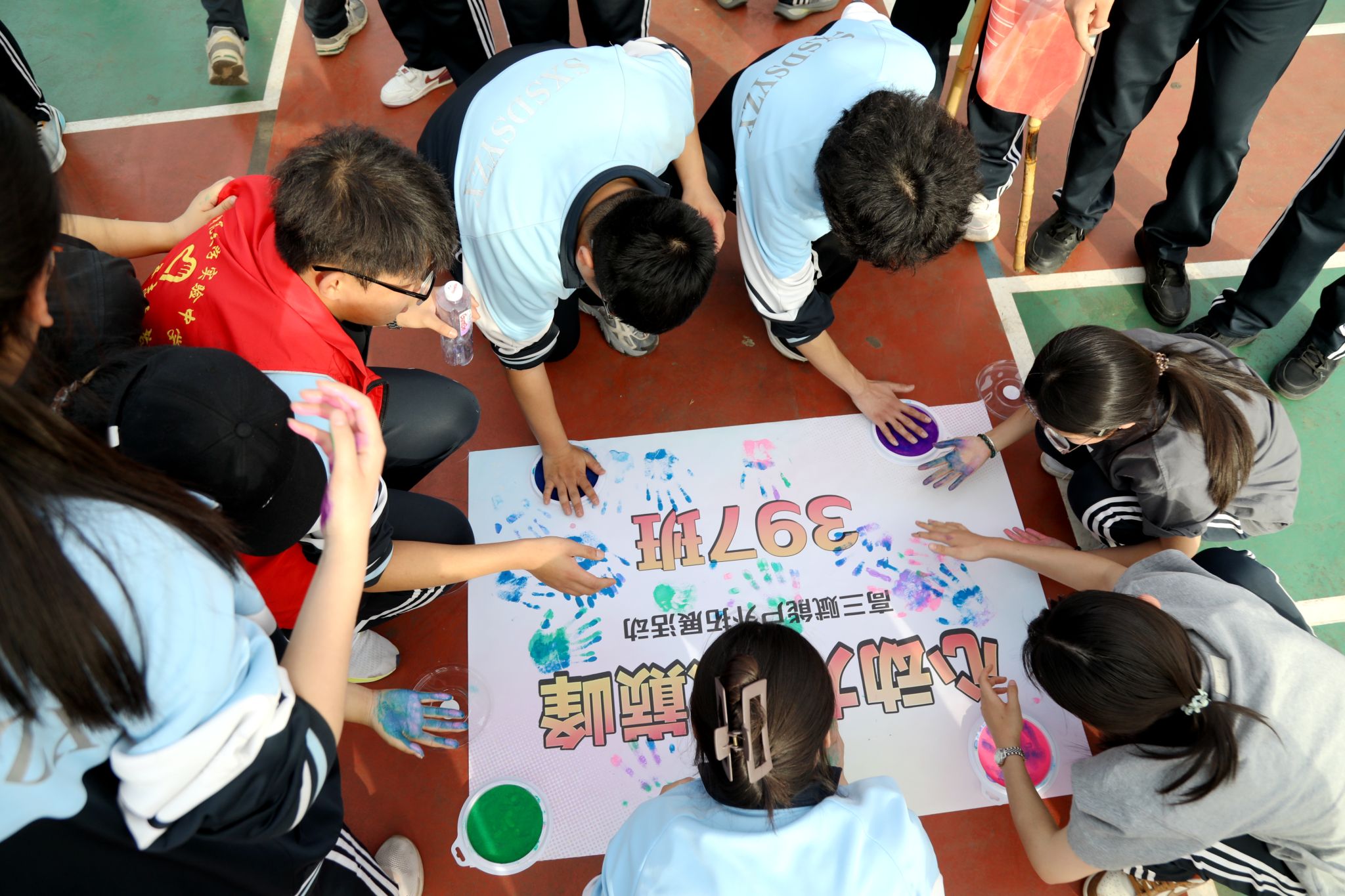 温情环节,如期而至。签名、手印,共同制作属于班级的纪念旗帜。一笔一画,写下赤诚心愿,一掌一印,留下青春印记。