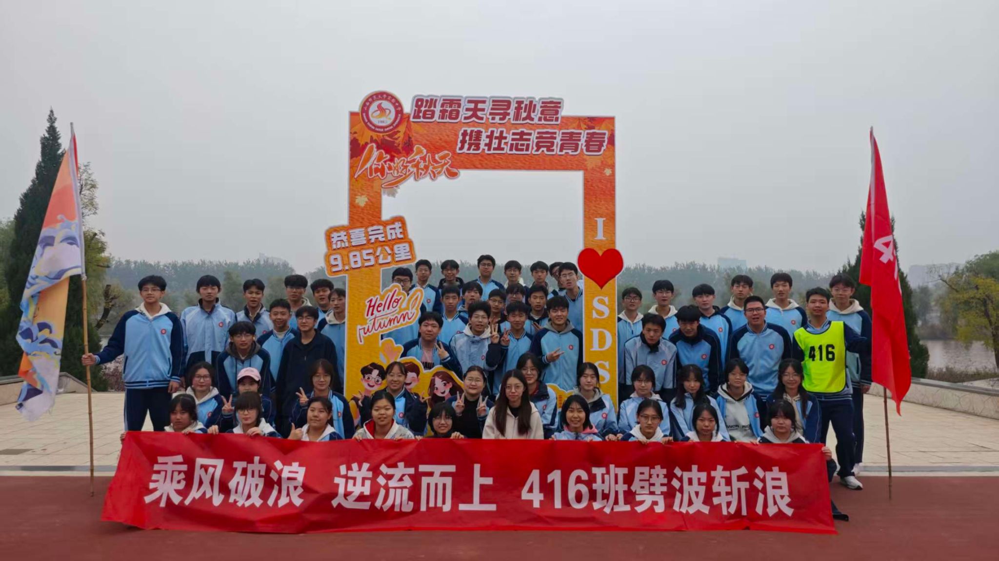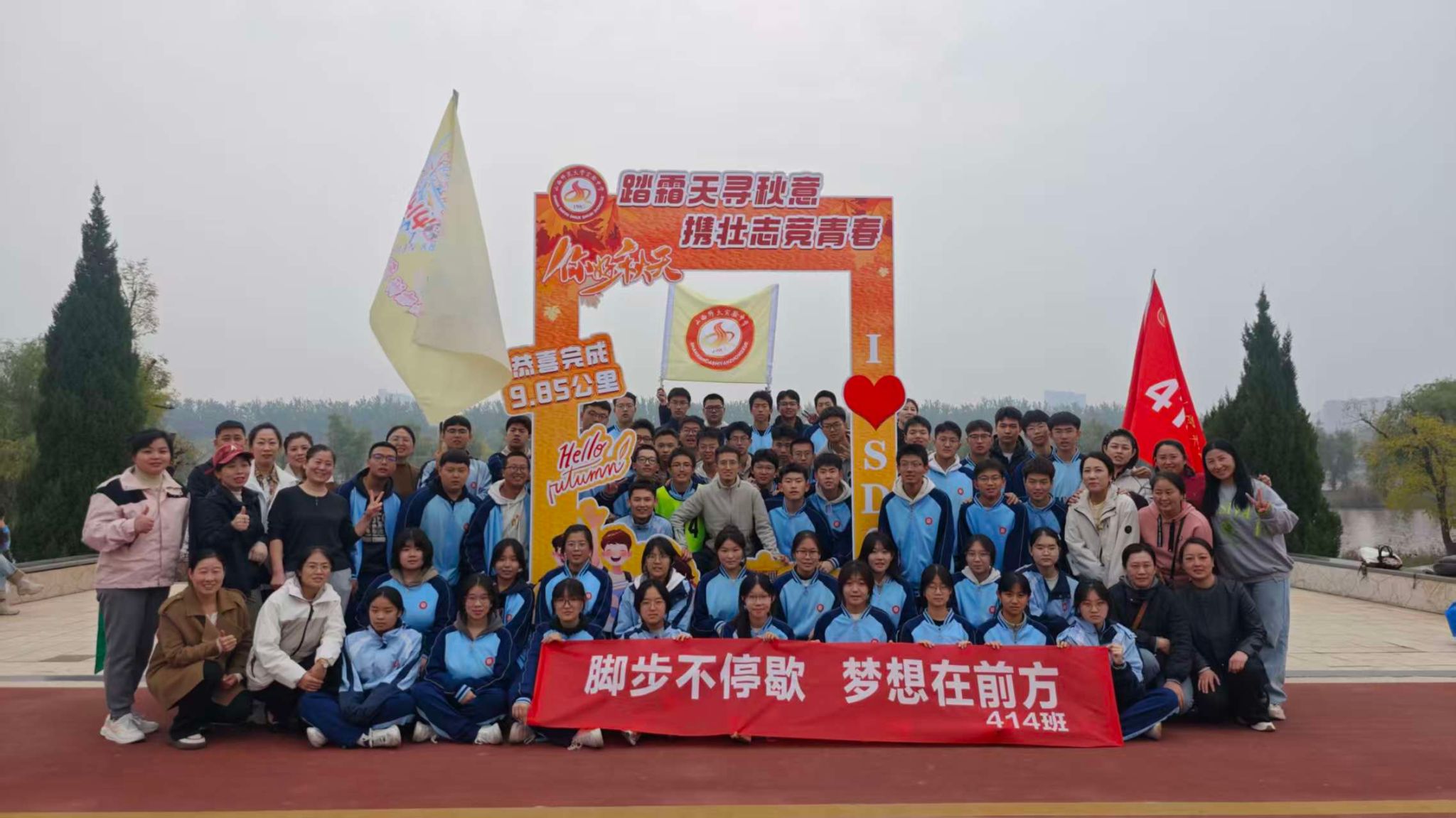 行至9.85公里处的棋阁广场,“985打卡点”成了师生的加油站。各班高举班旗留下合影,秋阳下的笑脸与飘扬的旗帜相映成辉,“全力以赴”“青春无悔”口号声响彻云霄。这是里程的标记,更是少年们对理想的告白——每一步,都是向未来的坚定奔赴。