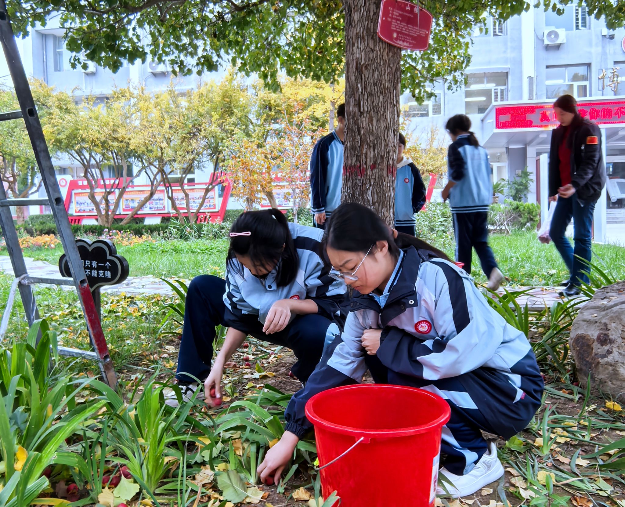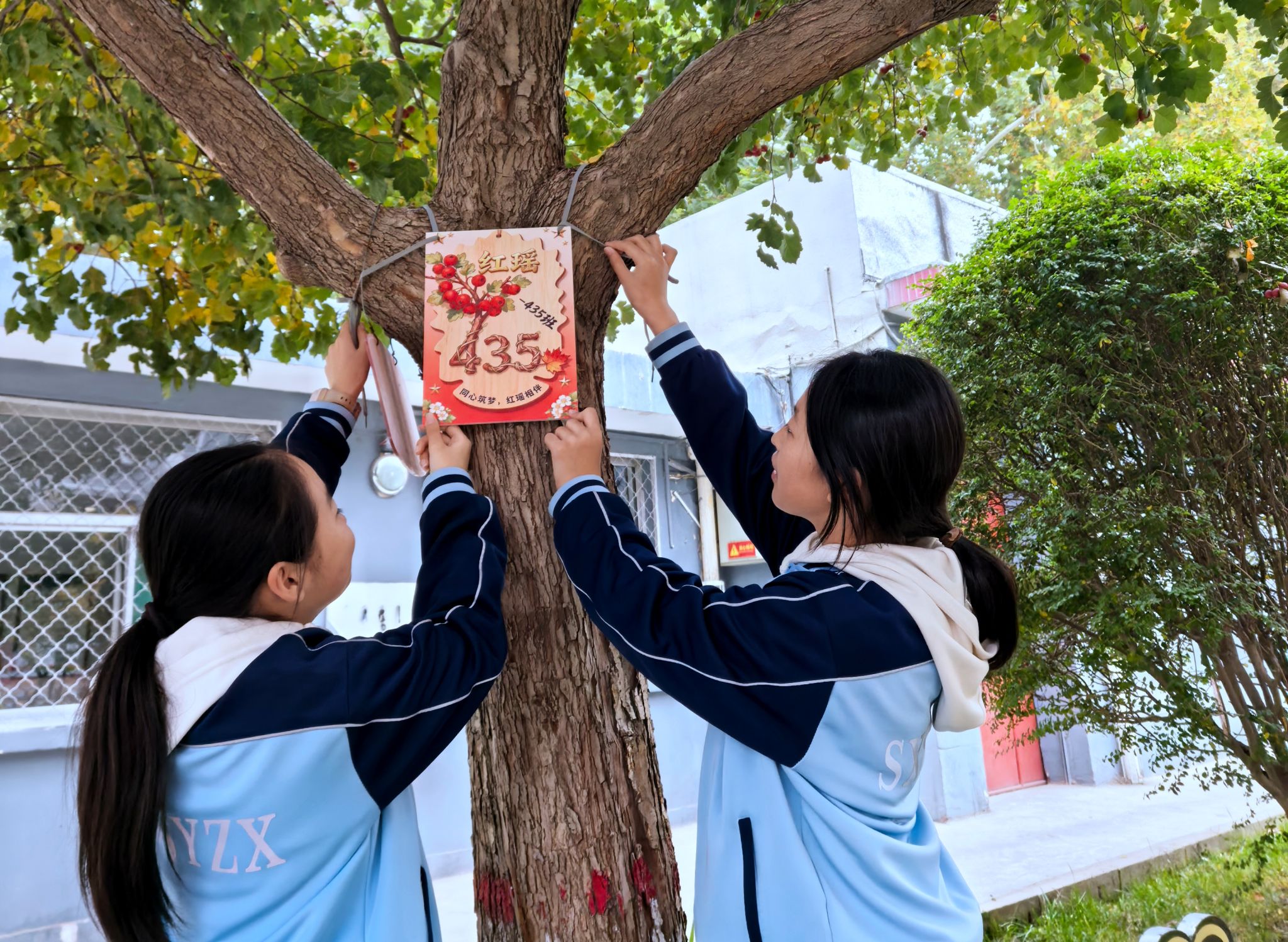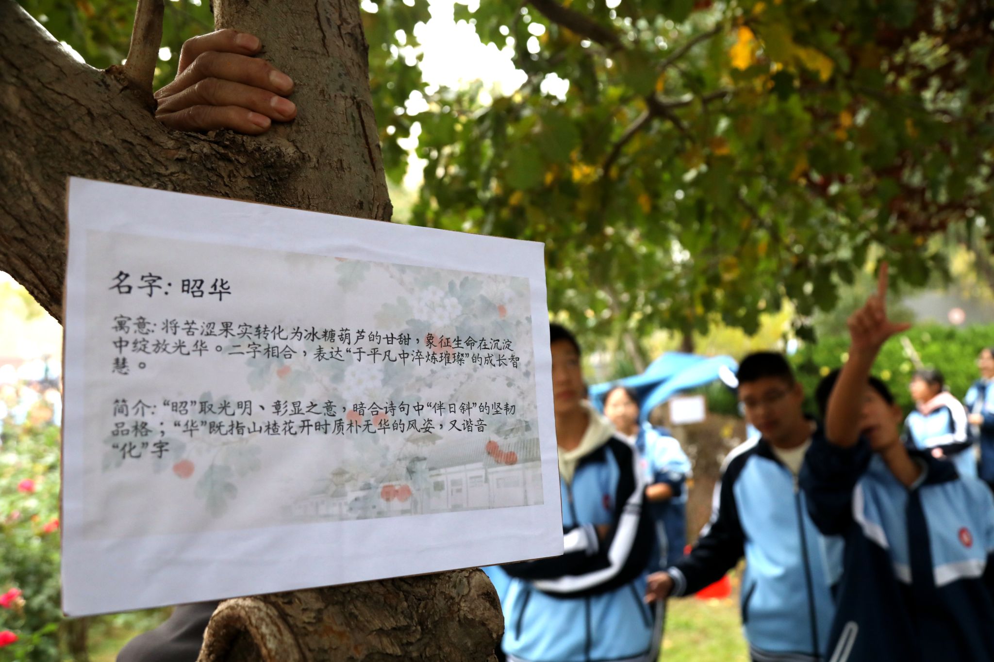 活动未始,仪式感先至。“山楂树承包命名”活动率先点燃了同学们的热情。高一、高二年级的同学以班级或小组为单位,为自己“承包”的山楂树挂上了精心设计的专属名牌。“红瑶”“初红”“昭华”……一个个名字充满了创意与期许,小小的挂牌不仅是标识,更是同学们与这棵果树的情感联结——从这一刻起,它们将成为陪伴学子成长、见证青春岁月的特殊伙伴。