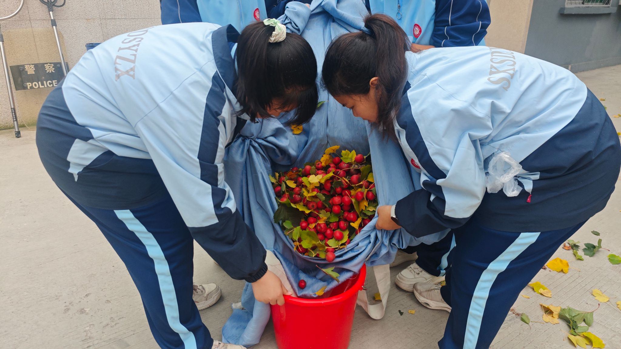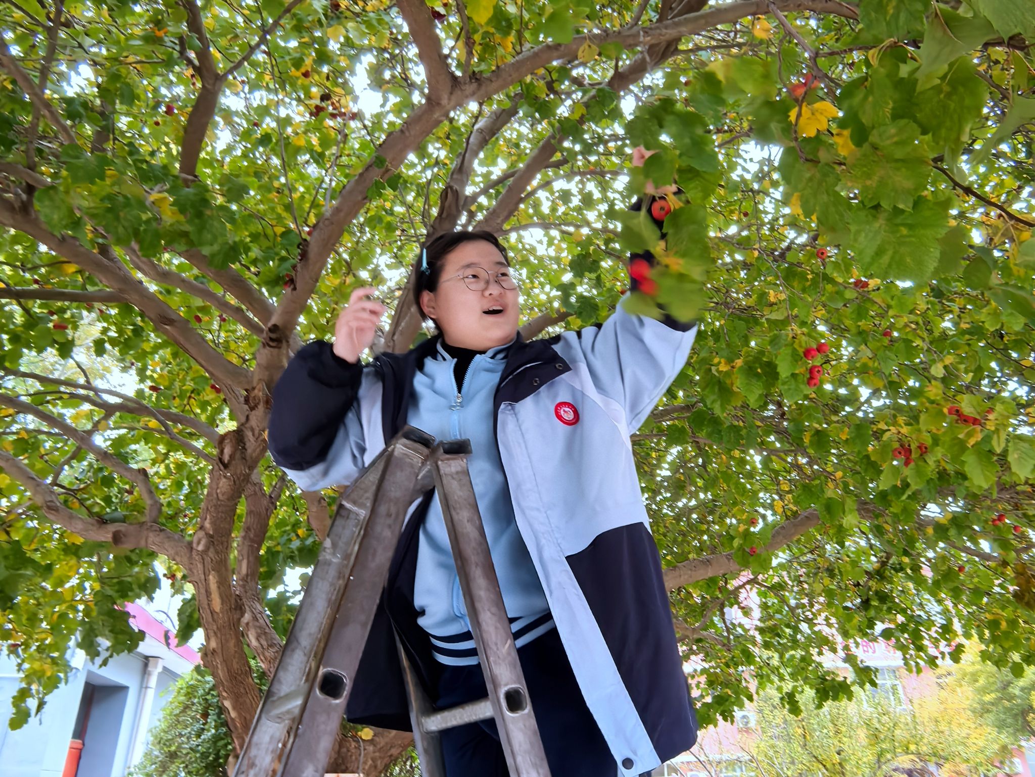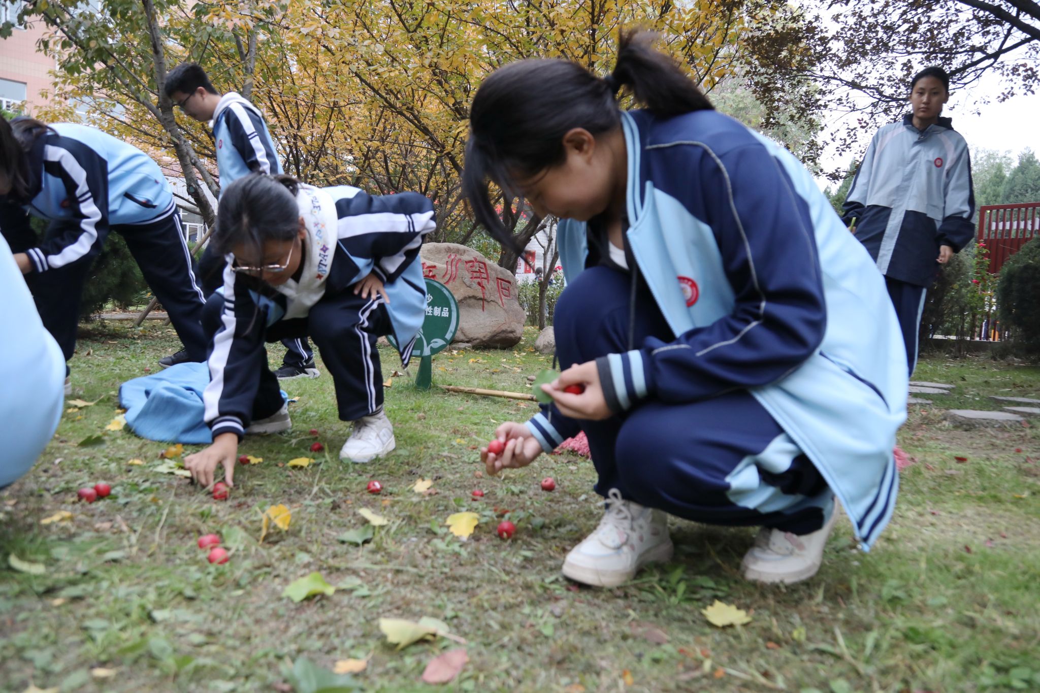 在政教处老师的组织引导下,采摘活动拉开帷幕!同学们带着工具,拎着小桶,兴致勃勃地奔向山楂树。一时间,树下人影攒动,欢声笑语此起彼伏。高个子上梯,采摘高处的“红宝石”,身手敏捷的同学攀上枝头,树下的伙伴撑着布单稳稳接住落下的果实,或仔细捡拾草地花丛间掉落的红果。默契的配合里满是热闹,校园也被这份劳动的鲜活填满。