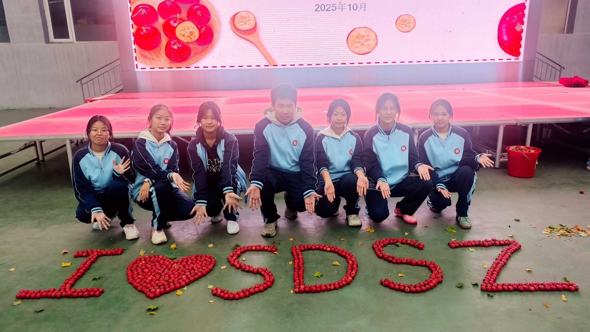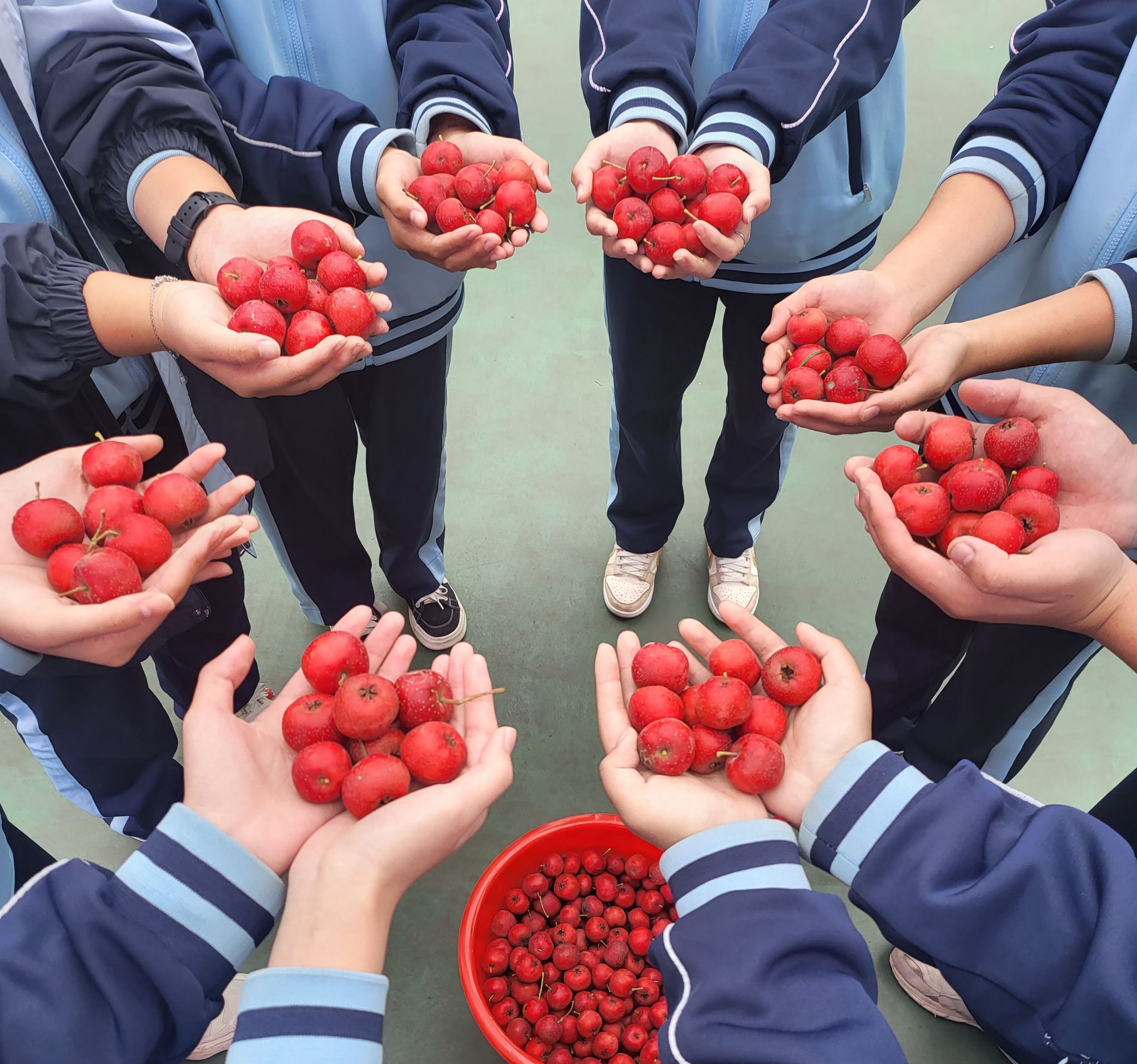 采摘下的山楂红艳圆润,装满了小桶,堆成了小山。满足之余,同学们发挥创意,圆润的果子在指尖排列组合,渐渐拼成了满含心意的文字: