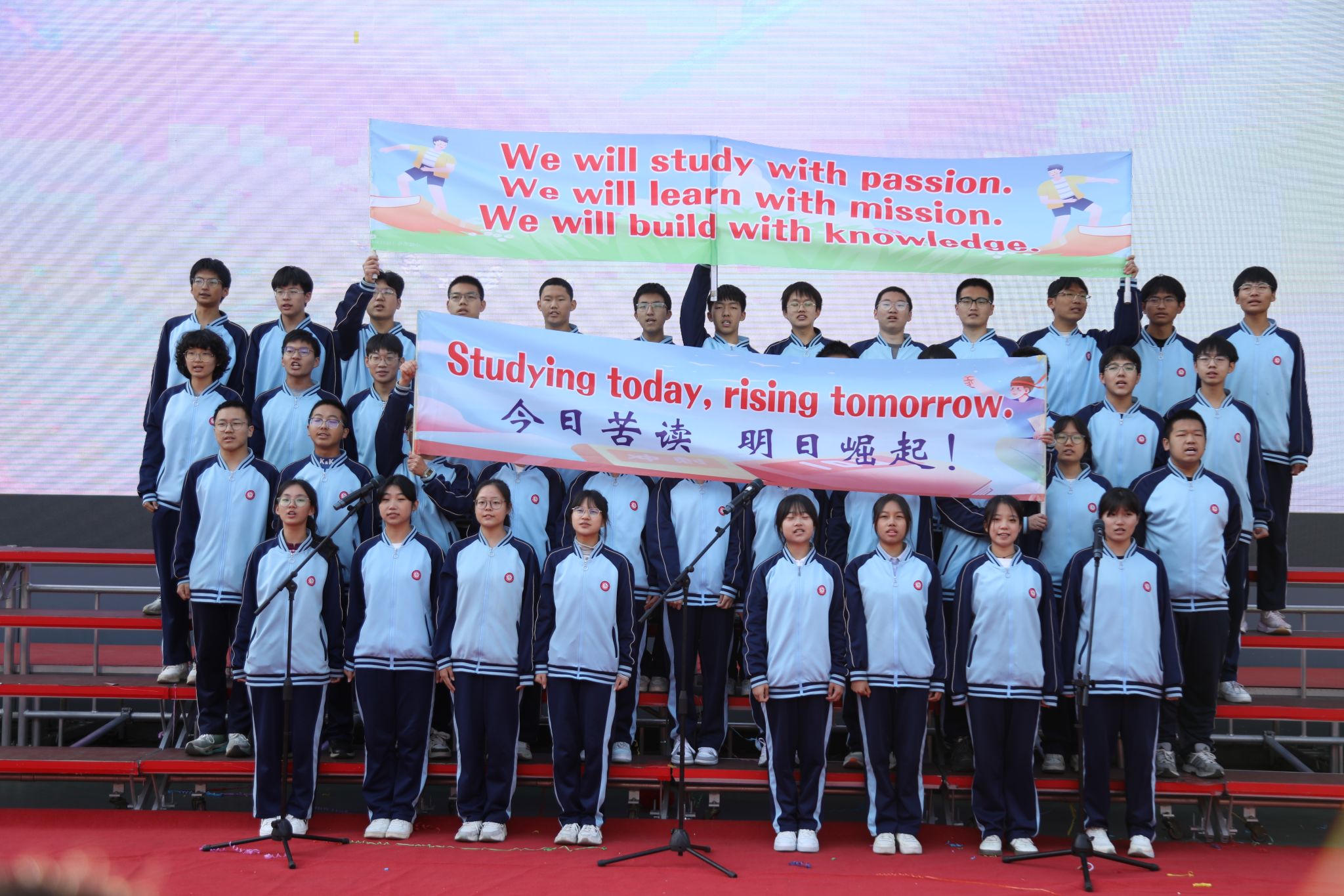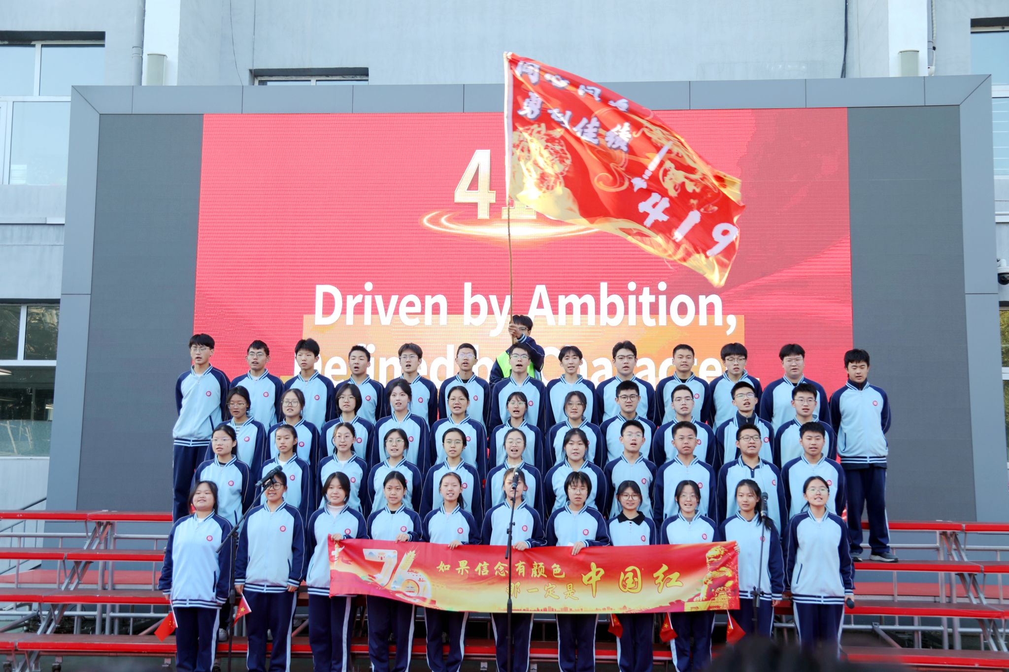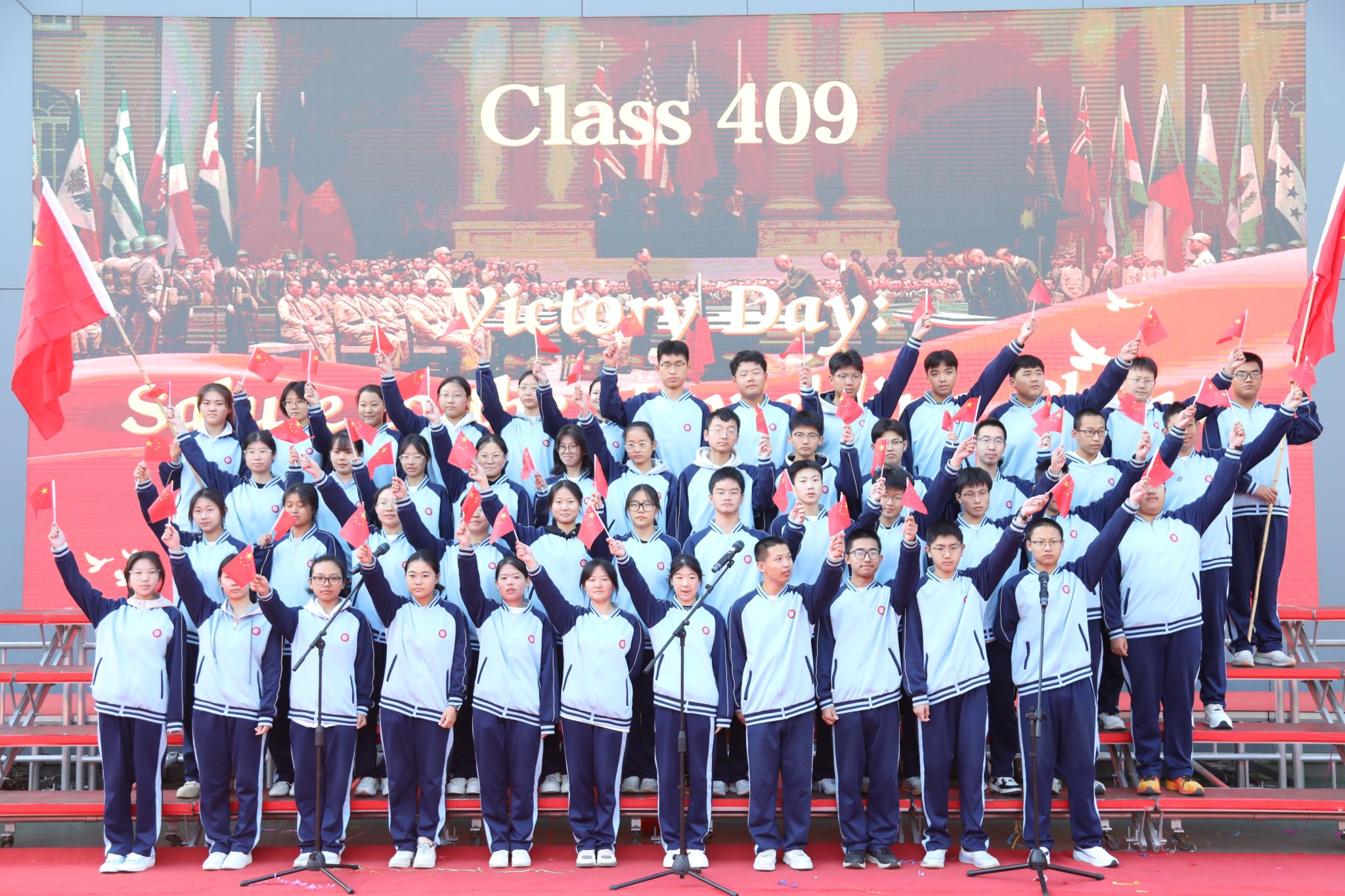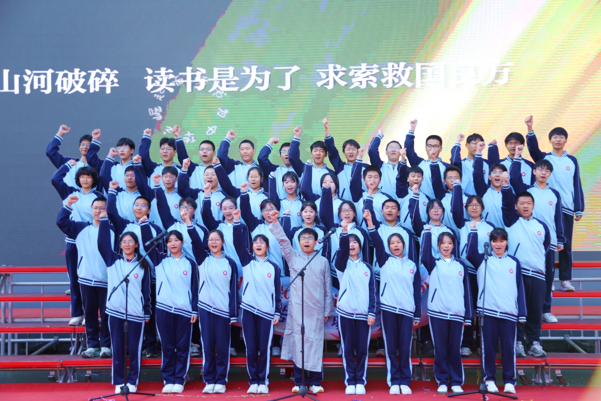 脉・风骨之韵致敬永不褪色的民族精神409班Victory Day: Salute to the Unyielding China于胜利日的回响里,致敬中国不屈的脊梁;414班The Barren Spring歌颂在生命的困境中对希望的渴求;418班The River All Red译《满江红》的豪肠,让岳飞的报国壮志在英文里依旧铿锵;413班What Do We Remember?在抗战胜利八十载的回眸中,拾英雄火种,传抗争薪火;408班的For China’s Rise, We Study以纸笔为舟,载青春志向,在求知的航程里驶向祖国崛起的远方;422班Chinese Youth--May Fourth Spirit溯五四精神长河,展青年风骨锋芒。每一段诵读都如一面精神旗帜,在岁月风华中高扬民族的自信。