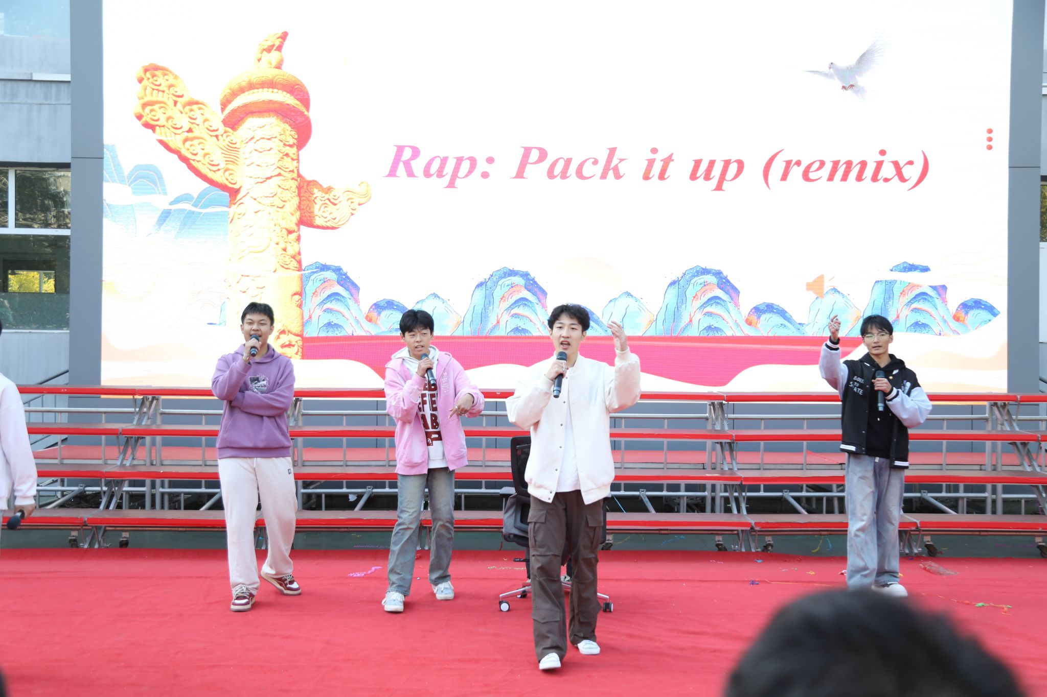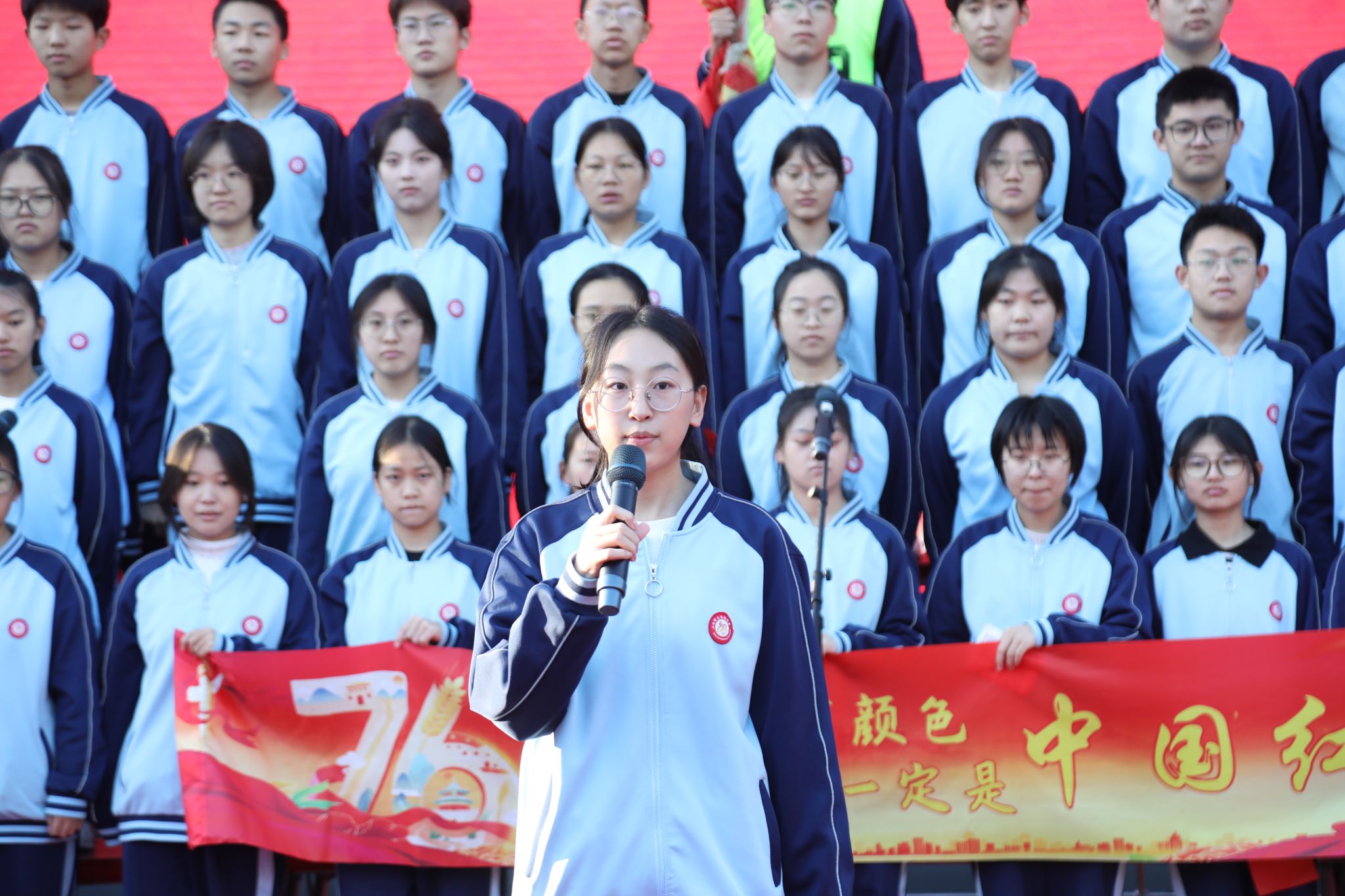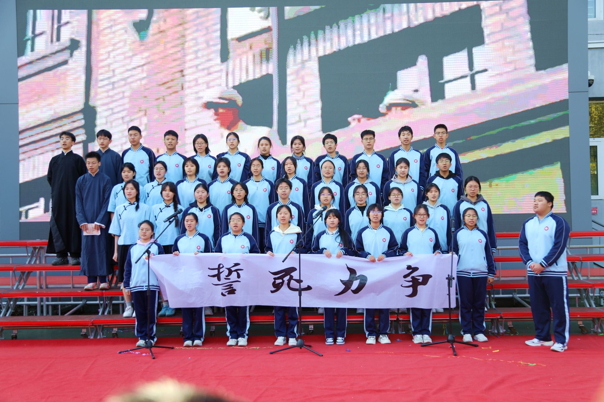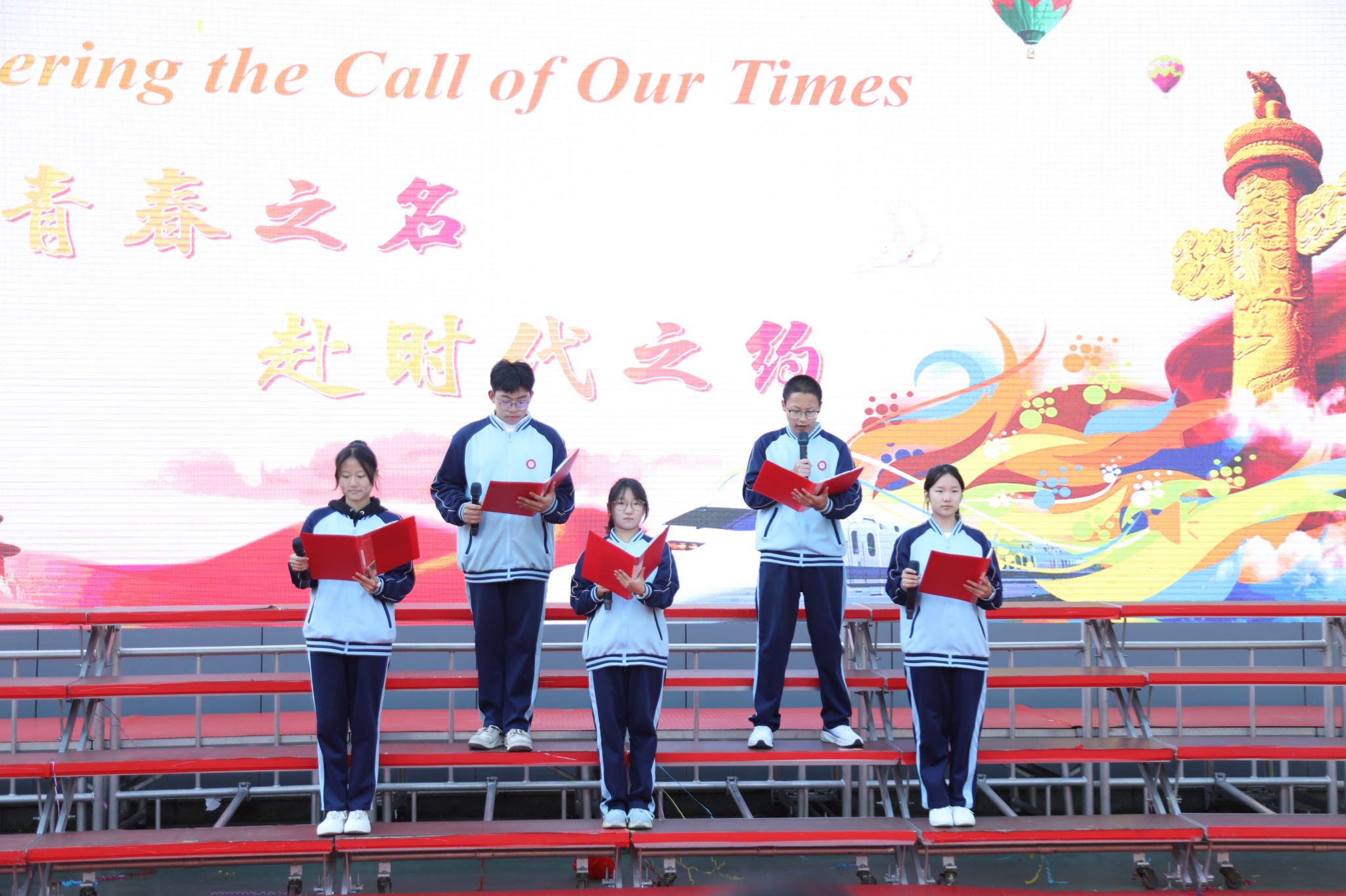 脉・风骨之韵致敬永不褪色的民族精神409班Victory Day: Salute to the Unyielding China于胜利日的回响里,致敬中国不屈的脊梁;414班The Barren Spring歌颂在生命的困境中对希望的渴求;418班The River All Red译《满江红》的豪肠,让岳飞的报国壮志在英文里依旧铿锵;413班What Do We Remember?在抗战胜利八十载的回眸中,拾英雄火种,传抗争薪火;408班的For China’s Rise, We Study以纸笔为舟,载青春志向,在求知的航程里驶向祖国崛起的远方;422班Chinese Youth--May Fourth Spirit溯五四精神长河,展青年风骨锋芒。每一段诵读都如一面精神旗帜,在岁月风华中高扬民族的自信。