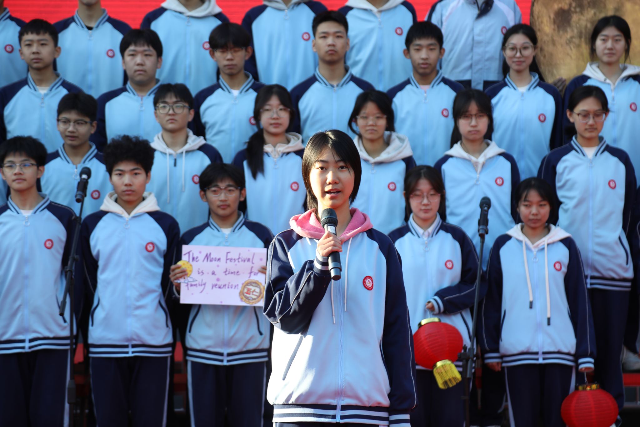 源・文明之光回溯千年文脉的璀璨从424班Chinese Calligraphy的笔墨丹青里,我们看见汉字横平竖直间的东方美学;419班Chinese Red用热烈的语言讲述朱红底色里的吉祥寓意与民族情怀;416班The Mid-Autumn Festival、411班The Chinese Spring Festival则以诗意表达,复刻了团圆佳节里的民俗风情与家国思念;423班Confucius and Ren带领全场穿越千年,感受儒家思想的智慧光芒。每一段诵读都似一把钥匙,打开了中华文明起源的大门。