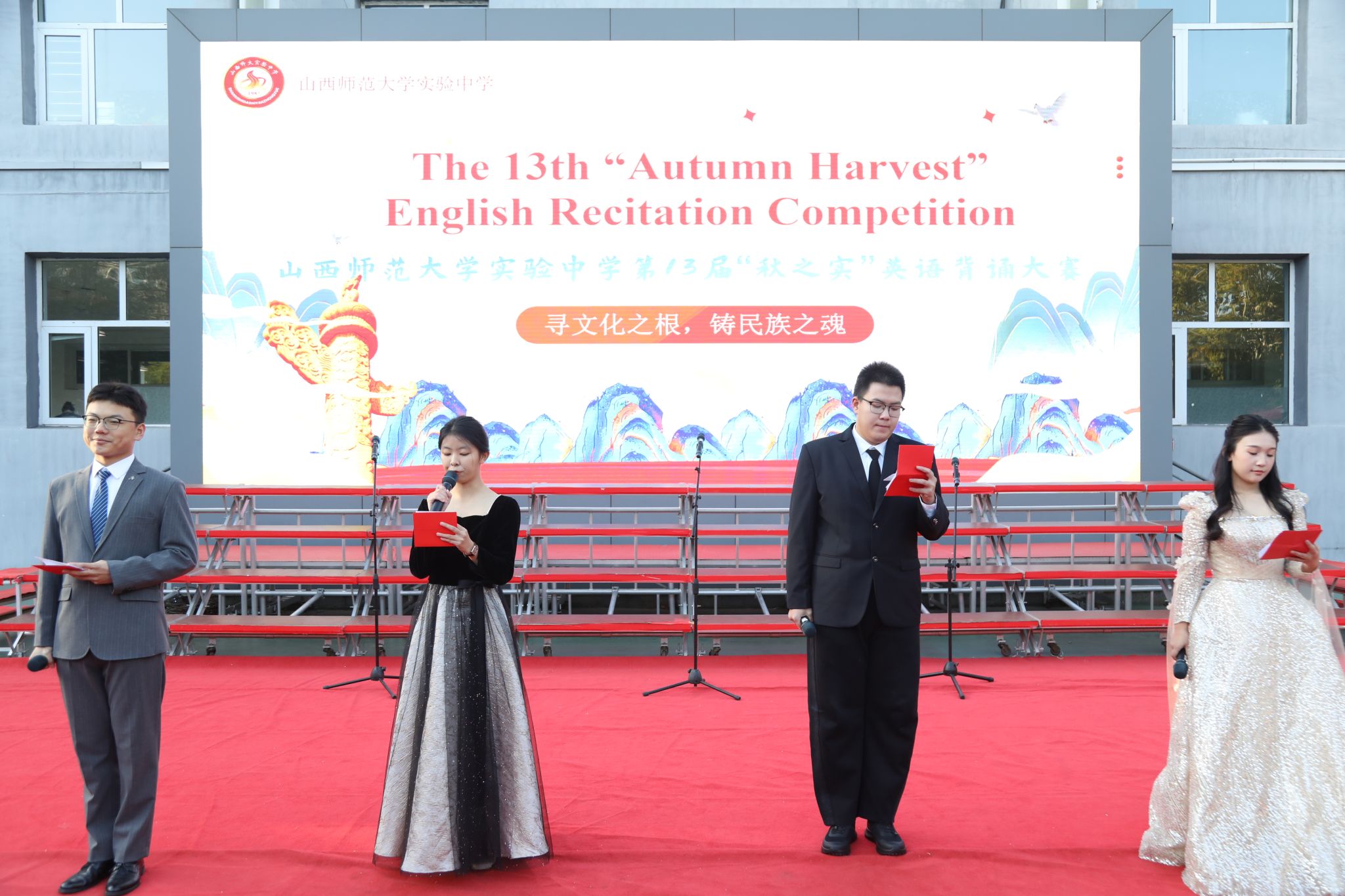 当《我和我的祖国》英文合唱响彻校园,当中国书法、航天精神等通过流利的英语娓娓道来,一场跨越语言与文化的盛宴在我校璀璨绽放。11月1日上午,我校第13届“秋之实”英语背诵大赛如期举行,高二年级全体学子以“寻文化之根,铸民族之魂”为主题,用声音复刻中华文明的璀璨,以热情书写当代青年的文化担当,将思政教育融入语言实践,为校园留下了一段难忘的双语文化记忆。校长辛小英、副校长武月元、教导处主任李明出席活动。