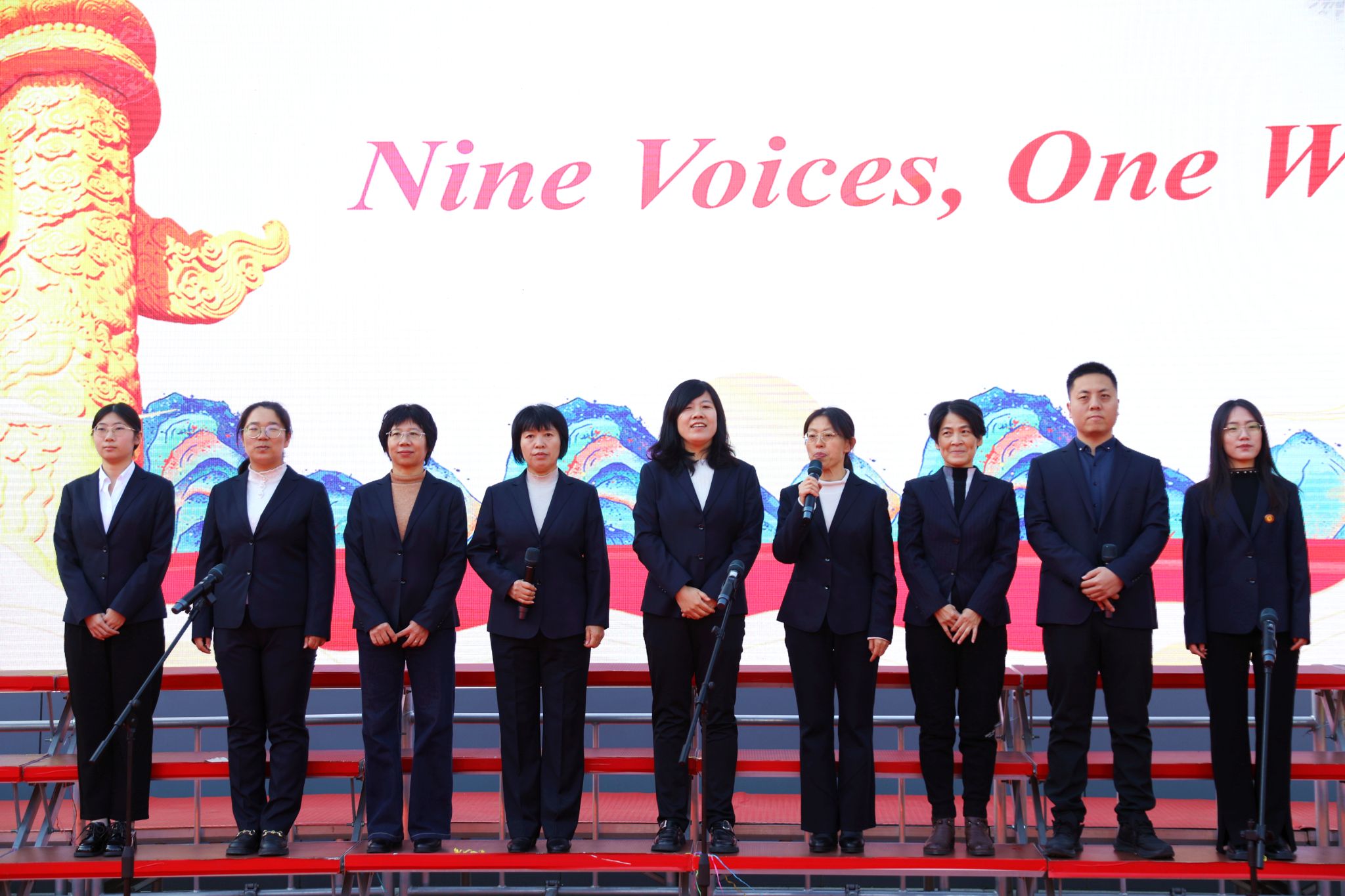 亮点纷呈,共赴文化之约本次大赛的穿插节目与教师风采展示同样令人印象深刻。英文歌曲串烧English Medley: Jasmine Flower, Blue and White China, Little Happiness,将《茉莉花》《青花瓷》等中式美学元素融入英文旋律;舞蹈Enjoy to the Fullest动感十足,展现青春风采;单词说唱Rap: Pack it up (remix)以潮流形式传递文化自信;朗诵In the Name of Youth, Answering the Call of Our Times点燃全场热情。此外,高二英语组全体教师集体朗诵Nine Voices, One Wish(《九音共愿》),用醇厚的嗓音与真挚的情感,传递出教师团队对学子成长的期许。